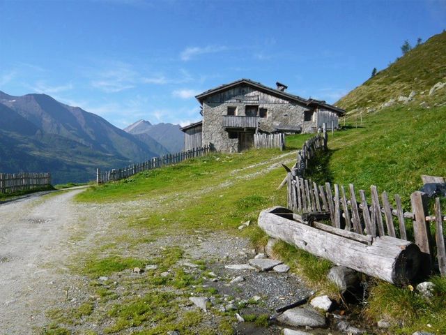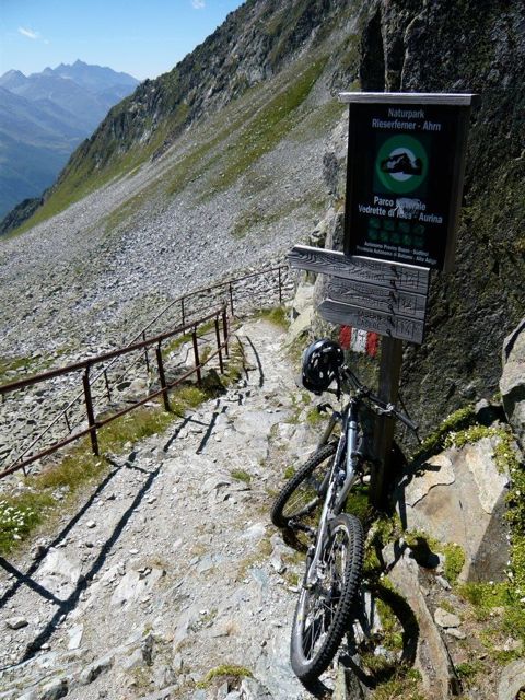 Per scendere dal Krimmler Tauern l’itinerario più logico sarebbe appunto la traversata da nord a sud, ma per noi italiani l’alternativa, scomoda e un po’ complicata, è salire da Predoi sulla sterrata per il Lago di Selva/Waldner See fin poco dopo la Starkl Alm 2029 m, salire a piedi per 500 metri circa sul sentiero 15, seguire poi a destra (est) il Lausitzer Weg (segnavia 13), il sentiero cioè che attraversa in quota tutta l’alta Val Aurina fin sotto il Krimmler Tauern, con qualche tratto attrezzato con cavi metallici, e, sempre spingengo la bici a mano, risalire gli ultimi 100 metri del sentiero 14 che faremo in discesa. Al passo la quota si fa sentire anche in pieno agosto, in fondo siamo alti come lo Jouf Fuart!, e, messa una maglia manica lunga, non ci resta che tuffarsi verso valle con davanti la visione magnifica dell’onnipresente Picco dei Tre Signori. A seconda dell’affollamento si potrà scendere più o meno veloci, perché qui, in provincia di Bolzano, i divieti alle bicidimont non esistono, solo il vecchio e sano buonsenso ci è da consigliere su come affrontare una discesa che, per forza di cose, ci porta a mollare i freni e godere di tanto bendidio ciclistico.