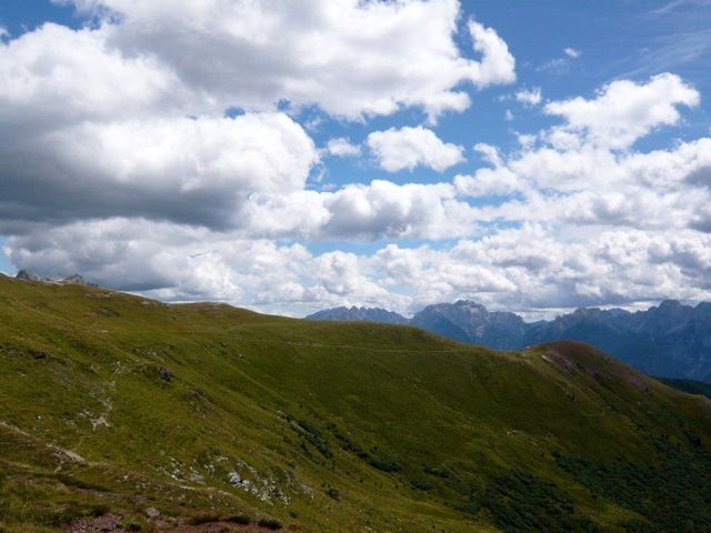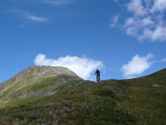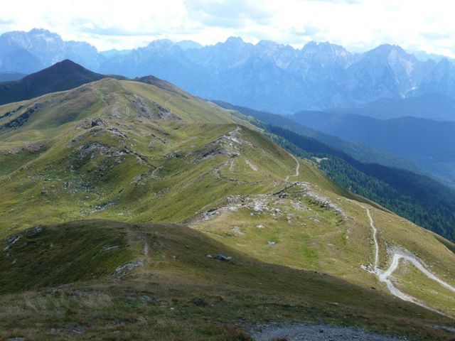 Ieri di nuovo su questa superclassica del Comelico, una gita lunghetta ma non difficile e di grande soddisfazione, visto il panorama che offre sulle Dolomiti di Sesto e il Comelico. Partiti alle 9:30 da Sega Digon ancora nell’ombra e un po’ infreddoliti visto il brusco abbassamento di temperatura della notte, e questo ci ha fatto forse spingere di piú sui pedali dato che prima dell’una eravamo già sotto il Col Quaternà. Breve sosta e poi giú a cavallo del crestone erboso che scende promettente in direzione sud fino ad entrate nel bosco e arrivare in vista di Casamazzagno. Qui è naturalmente da evitare la strada asfaltata che va a destra, bisogna andare dritti per una serie di mulattiere e sentierini fra l’erba poco appariscenti, continuare a sinistra della chiesa e con un divertente zigzagare fra le case si arriva a Candide alla S.S. 52 che si segue a sinistra fino alla