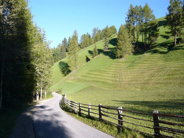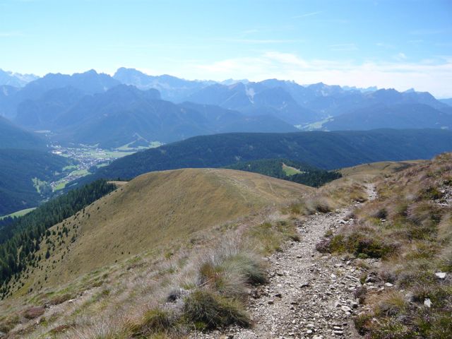 Usciti da Dobbiaco in direzione Nord si entra nella Valle di San Silvestro fino al bivio per Franadega/Frondeigen: lasciare qui l’auto, piccolo parcheggio sulla destra, e proseguire in bici sulla strada asfaltata in salita, passare la località Schöneggen dove finisce la strada asfaltata ( divieto di transito da qui in poi) e proseguire su sterrata nell’incantevole Silvestertal dove si trovano i primi cartelli dell’Alta Via di Dobbiaco/Toblacher Hohenweg, contrassegnata più avanti con il segnavia H. Arrivati in prossimità della Silvesteralm continuare sulla sterrata ignorando le indicazioni sulla sinistra del sentiero 1 e dell’Alta Via, che riprenderemo in alto, passare la malga e arrivare all’incrocio di stradine sulla selletta a 1800 metri: seguire la strada militare, Militarweg, e le indicazioni per il Markinkele/Cornetto di Confine. Per arrivare su questa cima, dove inizia la vera e propria traversata di cresta, ci aspetta una salita di 700 metri di dislivello su comoda strada militare che risale con lunghe zete tutto il crinale sud dello Strickberg in un crescendo spettacolare in quanto a panorami sulle Dolomiti di Sesto,Tre Cime di Lavaredo e Val Pusteria che da soli valgono un viaggio da queste parti. Quando, ai 2500 metri, la strada finalmente spiana e scende brevemente alla conca sotto il Markinkele, si entra in un altro mondo, essenziale, ridotto a tre elementi: il blu intenso del cielo, il verde dei pascoli, e il bianco sporco del sentiero davanti alla ruota della bici, e tutto diventa più semplice, la salita in piedi sui pedali e la successiva discesa, sempre in pedi sui pedali!, diventano un gioco faticoso ma bellissimo, un fantastico su e giù dove il piacere della guida dei nostri mezzi meccanici la fa da padrone.