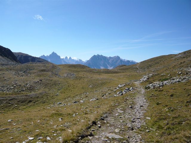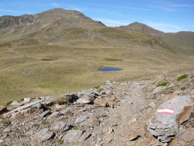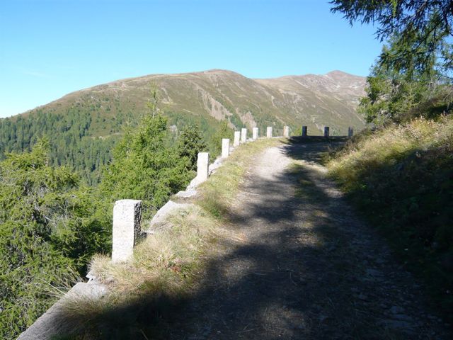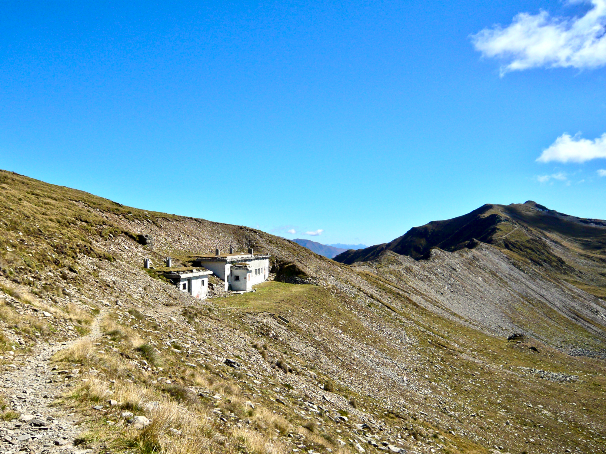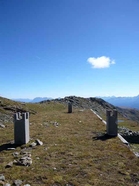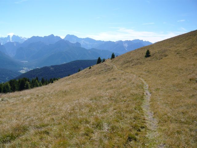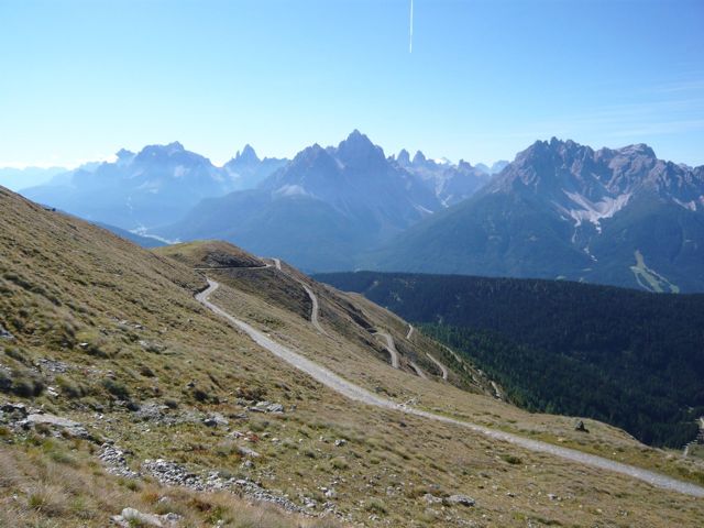 Dal Cornetto di Confine al Corno Alto l’Hohenweg passa sotto varie cime minori, la più alta è il Corno di Fana/Toblacher Pfannhorn 2663 m, molto frequentato dagli escursionisti da quando hanno riadattato a rifugio una vecchia caserma militare sul crinale sud a 2300 metri, con la costruzione della relativa stradella al posto della vecchia mulattiera militare: è stata così cancellata una fantastica discesa in mtb su una particolarissima mulattiera di ciotoli piatti, tipo quelli che al mare si fanno rimbalzare sull’acqua, che scendeva per 700 metri a stretti tornanti sul filo del crinale, del genere tuffo in valle. Peccato veramente, a questo punto del giro scendere di qua sarebbe un delitto anche in caso di ripiego. Continuando la traversata, qui contrassegnata anche con il 25a/24, si passa la Bocchetta di Fana e si affronta l’ultima salitina,a piedi, fin sotto il Corno Alto/Hochhorn. La discesa a Franadega, l’ho già detto, è bella a metà, ma dopo 5/6 ore di grande mountainbiking va bene anche così, e la voglia di birra fresca fa apprezzare anche 300 metri di dislivello sprecati su una sterratona.