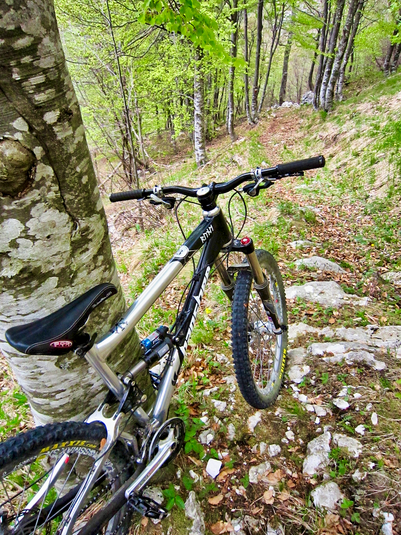 Itinerario: da Stolvizza a Coritis per asfalto a tratti ripidissimo, continuando per Casera Coot. Seguire il sentiero 642 a tratti pedalabile passando per Casera Berdo di sopra fino a Casera Canin. Continuare sul 642 in discesa per Coritis, molto tecnico. Alla strada asfaltata subito sotto il paese scendere a destra per poche centinaia di metri a prendere la forestale per ta na Rawni, mai troppo ripida e risistemata di recente. Poco prima dello stavolo di ta na Rawni, dove il posto merita comunque una sosta, sulla sinistra prendere in discesa lo stupendo sentiero 634 fino al borgo abbandonato di ta na Kolce. Continuare a destra sul 634, con un tratto favoloso a serpentine con sponde naturali, fino ai 1550 metri dove il sentiero diventa ostico e costringe a scendere a piedi fino al torrente Resia. Attraversato il ponte in legno si continua sul sentiero, bello nel tratto su cengetta rocciosa a fianco del torrente, e poi un po’ faticoso nella risalita finale, bici a mano, alla frazione di Ladina, da dove in breve si scende alle case di Stolvizza.