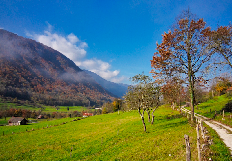 Il giro di planina Pretovč è così, una lunga salita di circa 10 km tutta su mulattiere e stradine forestali alquanto ripide e spesso faticose per il fondo mai compatto che attraversano boschi di rara bellezza, e per stradina forestale è da intendersi nel senso sloveno del termine, gozdna cesta, che non equivale alle nostre forestali larghe come autostrade! Qualche anno fa l’avevo percorsa nell’altro senso, scendendo dalla planina Sleme, adesso nella guida di Leon Leban Dolina Soče (edizioni Sidarta) è proposta come salita, segno dei tempi cambiati e dell’evoluzione delle attuali mtb allmountain capaci effettivamente di salire pedalando anche sui single track con pendenza non proibitiva. La discesa dalla planina Pretovč, più o meno di 7 km, è purtroppo solo in parte su single track, non difficile ma sempre su un fondo smosso di foglie e sassi, a cui segue una stradina forestale veloce e discretamente divertente. Arrivati all’auto la sensazione di aver compiuto un gran bel giro c’è comunque tutta, e in fondo non è questa la cosa che conta?