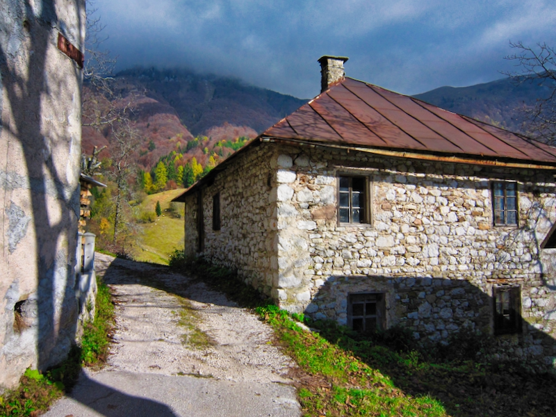 Itinerario: si parte da Gabrje, un paesino sulla destra orografica dell’Isonzo tra Tolmino e Caporetto. Uscendo dal paese in direzione Caporetto si prende una stradina asfaltata in piano sulla destra della principale che diventa subito dopo mulattiera con a valle un bel muretto a secco. La mulattiera indica già la direzione che si manterrà a lungo, salendo più o meno regolare sul fianco sudoccidentale del Mrzli vrh, noto per le più sanguinose battaglie fra Italiani e Austriaci nella Prima Guerra Mondiale. Ai 560 metri circa si gira un costone e si passa sul fianco occidentale della montagna, quasi sempre in ombra: da qui in poi ci si deve rassegnare al fondo più fangoso della mulattiera, che si fa ripida ed ostica, si attraversano due ruscelli e si scende a piedi in più di un occasione per via dei cancelli da aprire e chiudere: in questo tratto il segnavia da seguire è quello per Krn, il paesino sotto l’omonima cima che si comincia ad intravedere fra gli alberi. In ottobre qui i larici sono al massimo splendore, e lo spettacolo è assicurato.