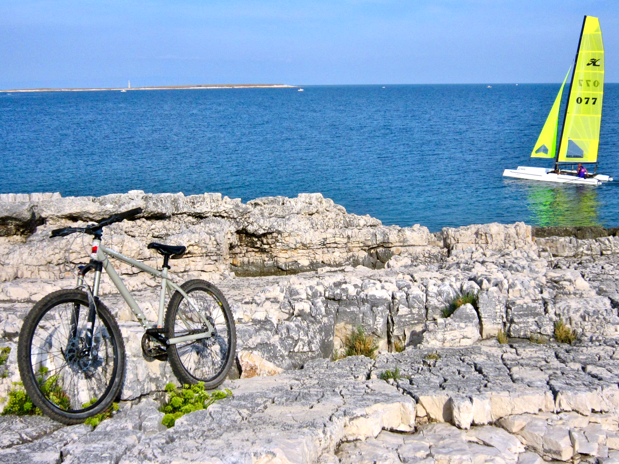 Premantura è un caratteristico villaggio all’estremità sud dell’Istria: passate le ultime case si entra nella penisola di Kamenjak, diventata Parco Naturale, lunga sei kilometri e larga uno, con qualcosa come trenta km di baie e spiagge di ciotoli o scogli che ne fanno un posto di straordinaria bellezza e integrità ambientale, da impressionare anche il più fanatico dei montanari. Le strade di accesso sono naturalmente sterrate, e molto polverose nelle estati secche, ma il fatto più interessante per un biker è la rete di sentieri che costeggia il mare, con le belle pinete da una parte e le scogliere o le spiagge dall’altra, perfette per una pedalata stile cazzeggio con la mountainbike. Oddio, forse il termine “mountain” qui andrebbe rivisto e aggiornato, forse sarebbe meglio parlare di marine xc, o postmountainbike. D’altronde, sappiamo tutti che questo sport è nato in prossimità del mare.