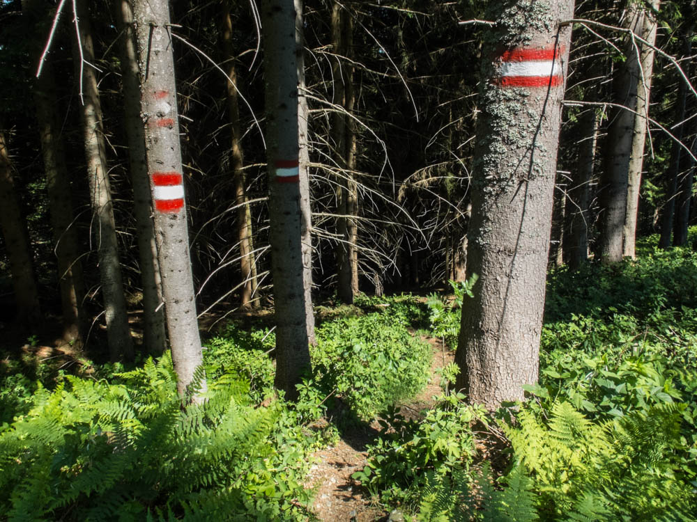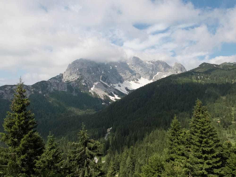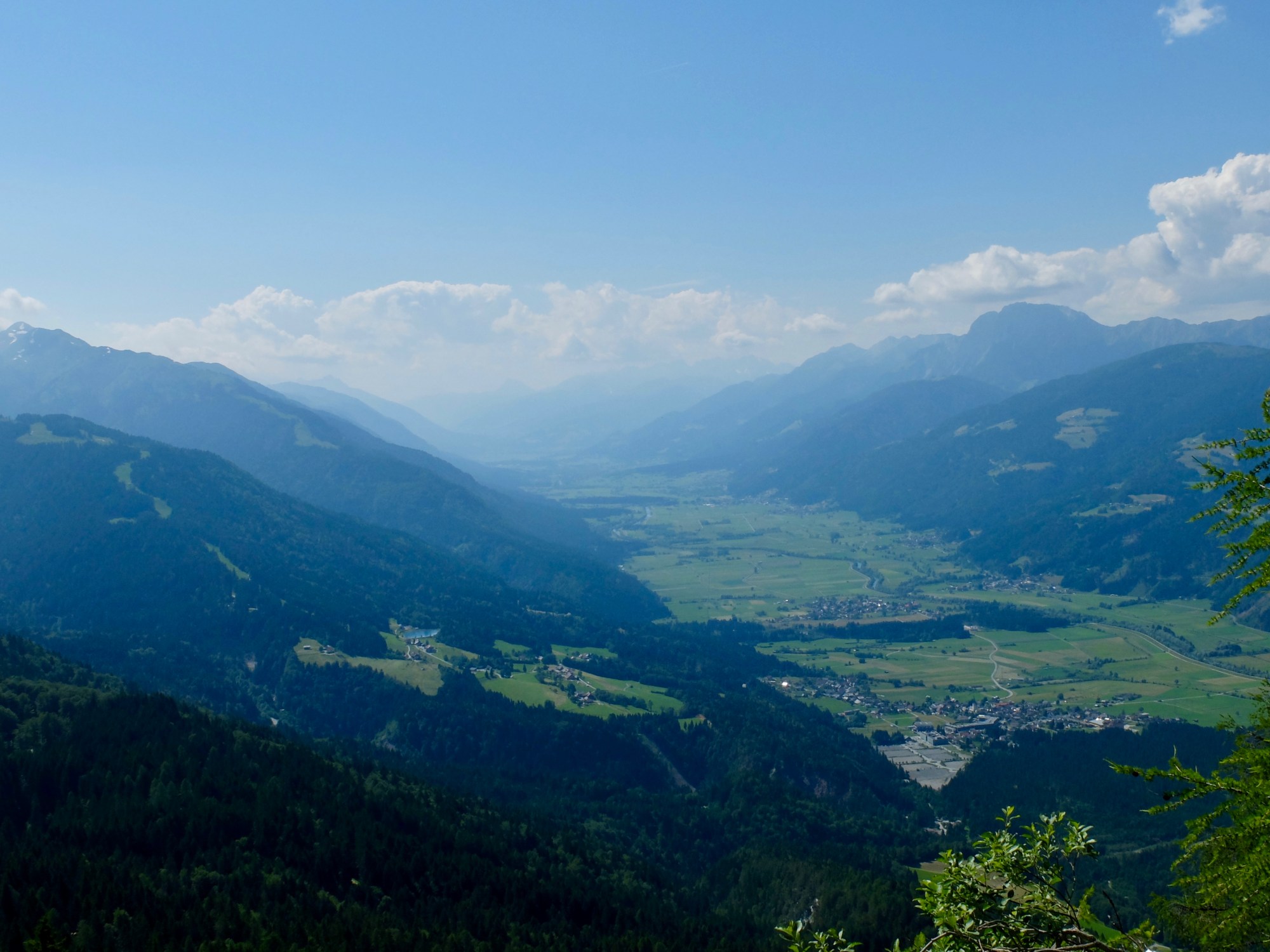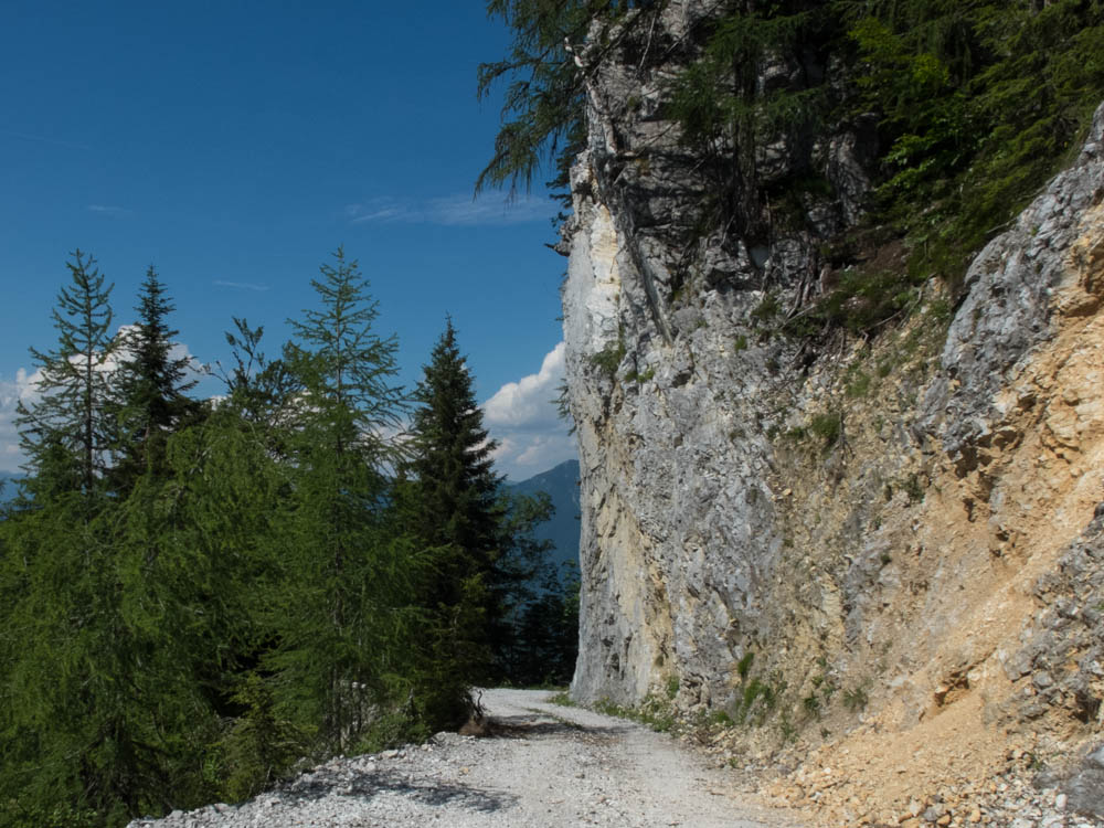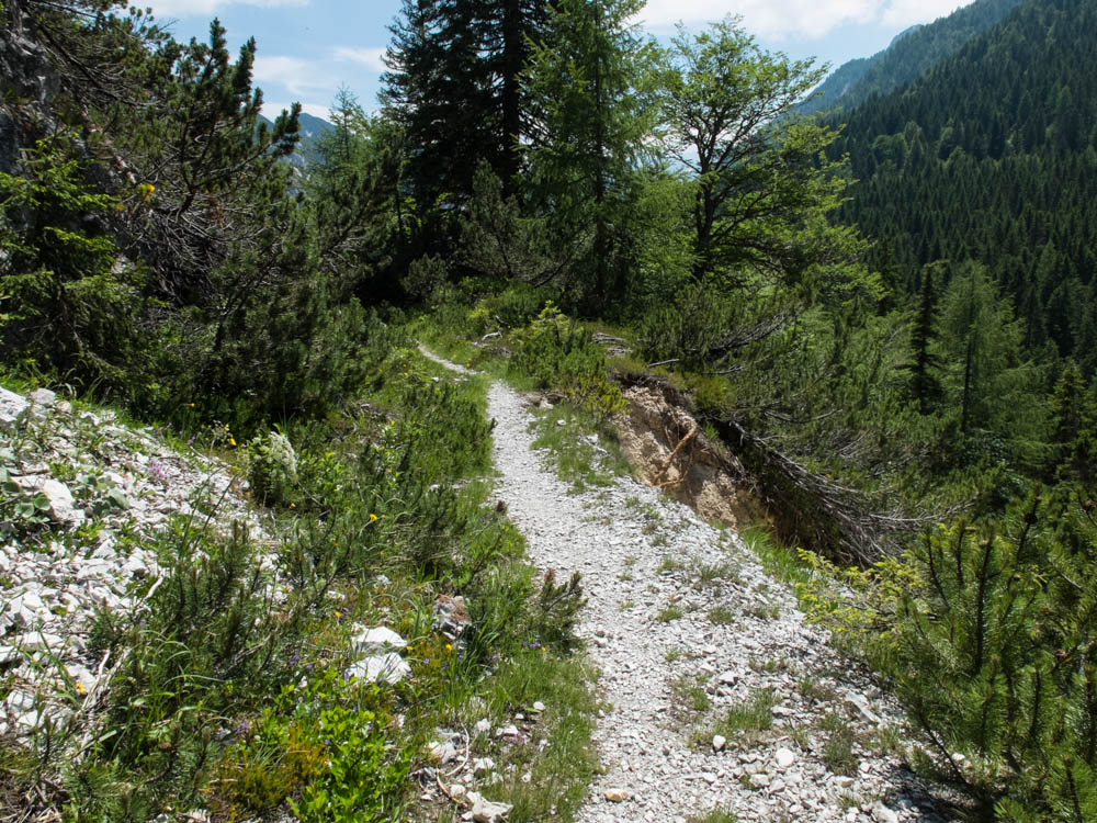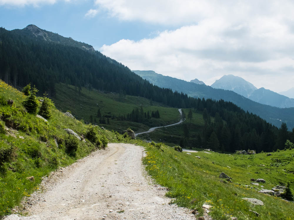 99,74 km, questo segnava ieri alle 9 di sera a Pontebba il mio gps, ma vaff… bastava partire 130 metri prima e facevo il botto, quando mai mi ricapiterà di nuovo… Pazienza, sarà per la prossima volta, anzi, magari anche no, viste le 9 ore e passa e i 2300 metri di dislivello (!), però, dai, un giro epico d’estate ogni tanto ci vuole per sgranchirsi le gambe, haha. Ero partito per fare un tratto della Traversata Canica da Pramollo al Vallone di Malborghetto, che in gran parte conoscevo già, ma gli anni passano, le montagne franano e tanti saluti a quei bei sentierini a mezzacosta che ti facevano passare magicamente sospesi nel vuoto… e così, sul 403 fra Sella della Spalla e Sella Zille, quando mancava veramente poco allo scollinamento, il troj si smaterializza davanti a me ricordandomi la regola del “non fare mai a giugno sentieri esposti a rischio frane che quelli del CAI non sono ancora passati a fare la manutenzione!”. Sotto il sole dell’una del pomeriggio non ho avuto nessuna voglia di rischiare di incrodarmi su uno stupidissimo sentiero, volevo un giro easy con la front e tutto questo stonava con il resto della giornata. Piano B: ritornare alla Sella della Spalla, scendere per la sterrata al Garnitzenbach e risalire alla Kühmeyer alm a prendere lo spettacolare 410 che scende Moederndorf nella Valle del Gail.
