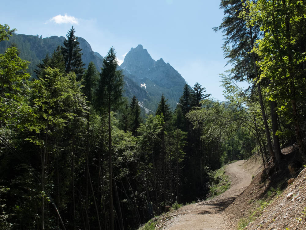 L’Austria è un paese bellissimo, ma non ci vivrei 😉 Tutte queste strade forestali non segnate su nessuna mappa ti fanno credere di abbreviare il percorso e poi finiscono con una piazzola in mezzo al niente, le odio. Bene o male arrivo alla sterrata con il segnavia 410, la seguo per un tratto e quando becco il segnavia del 401 mi butto a destra nel bosco, ma un’altra bella sorpresa mi aspetta al varco: alberi sconquassati dalla tanta neve dell’inverno a coprire la traccia del troj, per due tratti da rendere impossibile la discesa in bici, porca zozza! Mi rifaccio nella parte bassa dove il dmr se la gioca alla grande, sponde a destra, sponde a sinistra, qualche mini saltino e arrivo alla piana del Gail con il sorriso stampato in faccia, no, aspetta, forse era per la ragazza austriaca che pigliava il sole in bikini nell’ultima casa del paese ignara dei possibili biker venuti giù dal monte, non male come rientro nella civiltà.