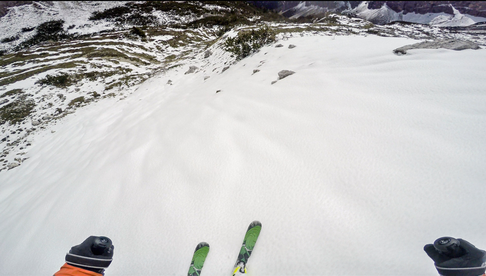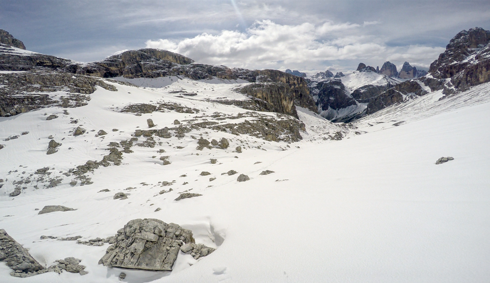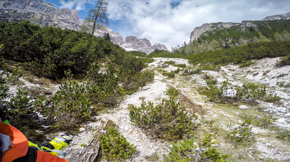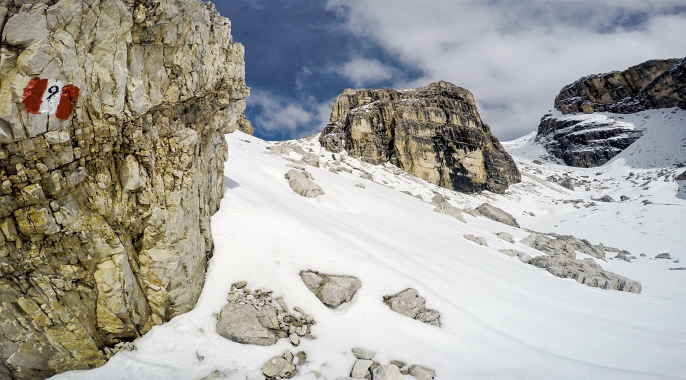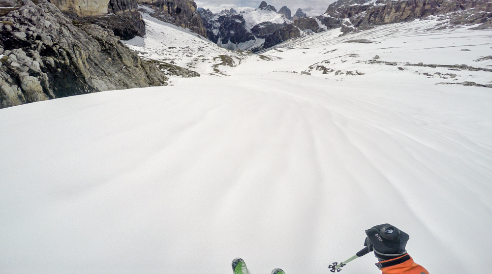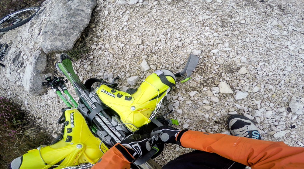 La prima volta qui è stato credo quattordici anni fa, tutto in giornata partendo da Udine, era metà giugno e un meteo spettacolare, mi mangio le mani ancora adesso a pensare di non aver fatto neanche una foto ma avevo la scusa di dover alleggerire lo zaino il più possibile. Quest’anno son voluto tornare ossessionato dal posto e dalla voglia di un’ultima sciata, ma la neve caduta nei giorni scorsi ha spezzato il mio sogno di arrivare in cima e a 2450 ne ho avuto abbastanza di fare la traccia in 30-40 cm di neve bagnata, il pendio finale non tanto sicuro e l’aria decisamente freddina mi hanno fatto decidere per il dietrofront. La sciata non è stata quella gran cosa, niente firn come volevo ma qualche serie di curve mi sono riuscite, grattatine sui sassi comprese, ma sono riuscito a divertirmi ugualmente, poi quattro passi a piedi fra i mughi, cambio assetto e giù in sella alla mtb su un sentiero che solo le Dolomiti sanno regalare, fondo da compattissimo a poco ghiaioso, qualche gradinetto roccioso da superare in scioltezza, serpentine facili e rettilinei fantastici nel bosco, una goduria fino al parcheggio.