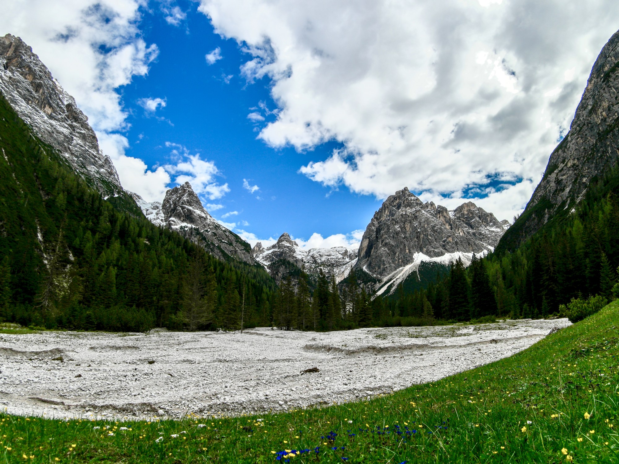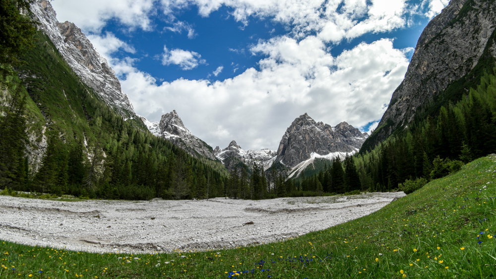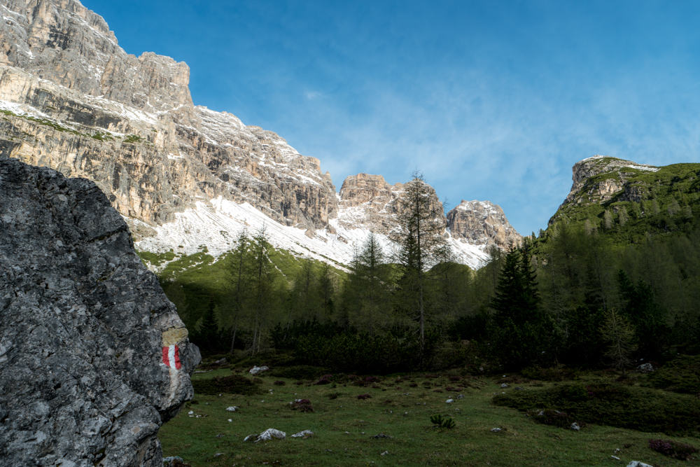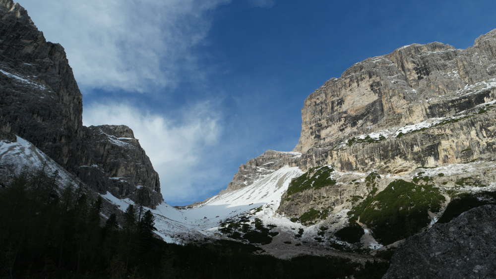 La prima volta qui è stato credo quattordici anni fa, tutto in giornata partendo da Udine, era metà giugno e un meteo spettacolare, mi mangio le mani ancora adesso a pensare di non aver fatto neanche una foto ma avevo la scusa di dover alleggerire lo zaino il più possibile. Quest’anno son voluto tornare ossessionato dal posto e dalla voglia di un’ultima sciata, ma la neve caduta nei giorni scorsi ha spezzato il mio sogno di arrivare in cima e a 2450 ne ho avuto abbastanza di fare la traccia in 30-40 cm di neve bagnata, il pendio finale non tanto sicuro e l’aria decisamente freddina mi hanno fatto decidere per il dietrofront. La sciata non è stata quella gran cosa, niente firn come volevo ma qualche serie di curve mi sono riuscite, grattatine sui sassi comprese, ma sono riuscito a divertirmi ugualmente, poi quattro passi a piedi fra i mughi, cambio assetto e giù in sella alla mtb su un sentiero che solo le Dolomiti sanno regalare, fondo da compattissimo a poco ghiaioso, qualche gradinetto roccioso da superare in scioltezza, serpentine facili e rettilinei fantastici nel bosco, una goduria fino al parcheggio.