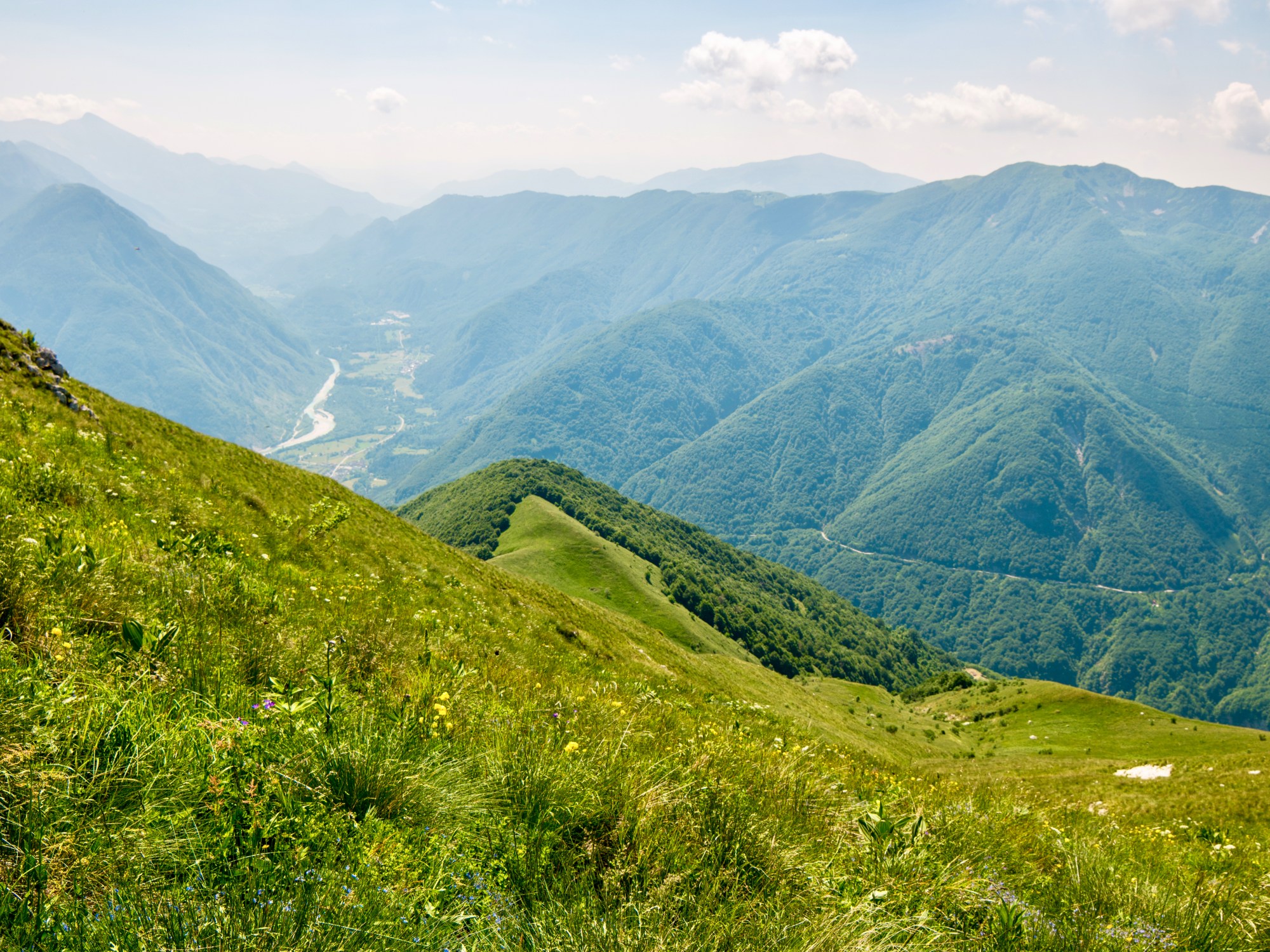 Andare in Val Resia d’estate per molti significa bagni nel torrente, birre, panini, crema solare e asciugamano, e ci sta anche viste le stupende vasche naturali scavate dall’acqua nel calcare bianchissimo dei vari torrenti sparpagliati in tutta la valle. Pedalare con la mtb invece vuol dire partire prestissimo e scendere prima di cuocersi la testa e di friggere la gopro sul casco sotto il sole di mezzogiorno, e se parti tardi è d’obbligo scegliere un giretto corto. Il Monte Guarda o Skutnik in sloveno è perfetto allo scopo, dislivello di soli 650 metri anche se ben poco pedalabili in salita con bici NON elettriche e quasi tutti da fare a piedi, ma in compenso discesa divertente e panorami super, per sfuggire all’afa cittadina e per un’infrasettimanale mattutina di quelle che non sai dove andare è l’ideale.