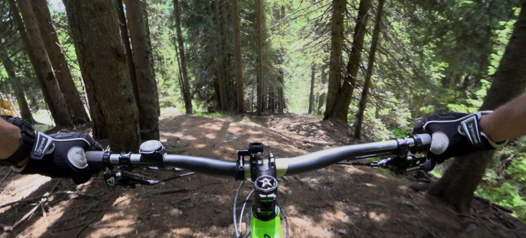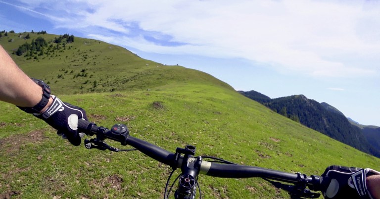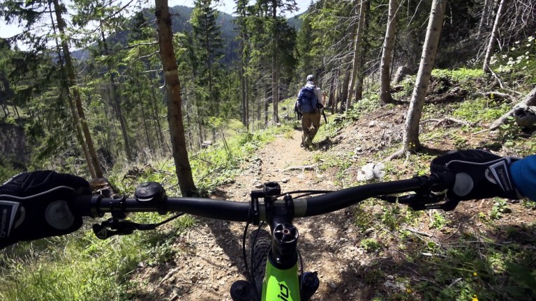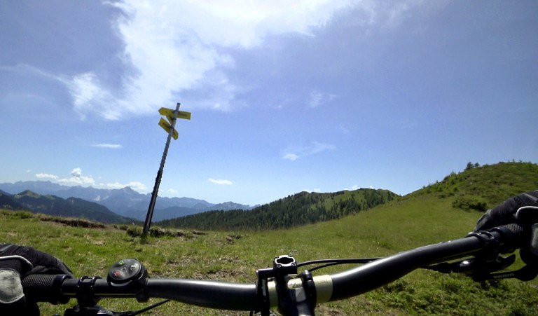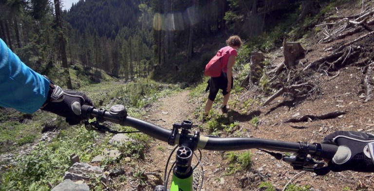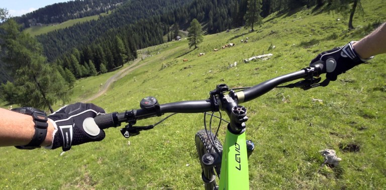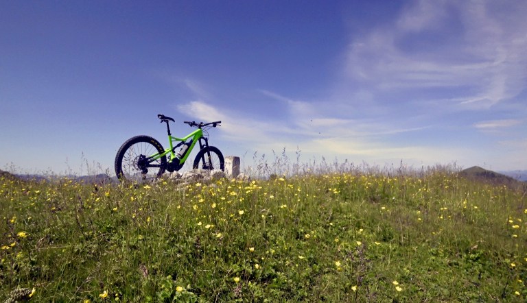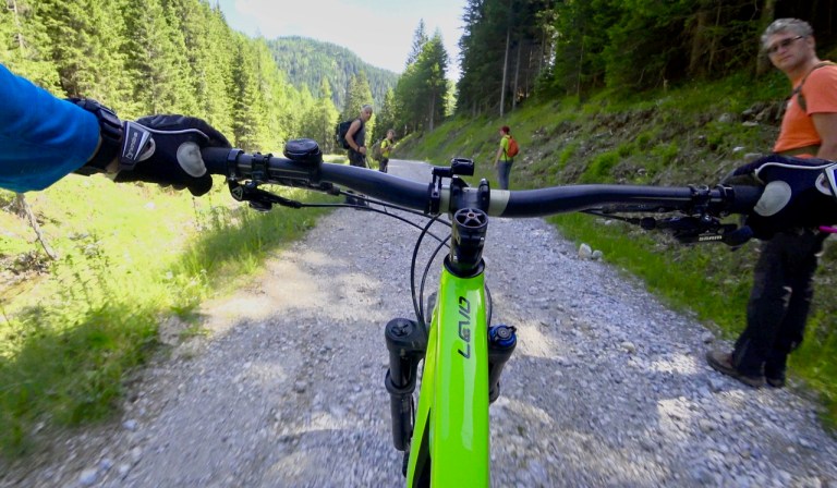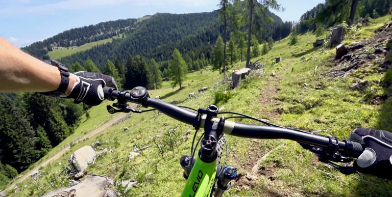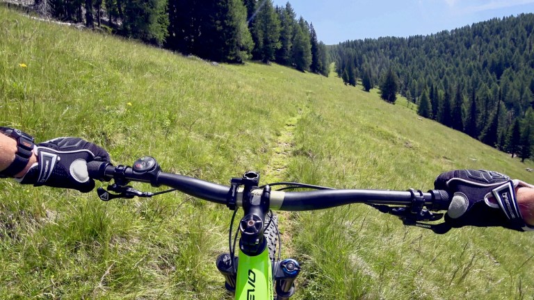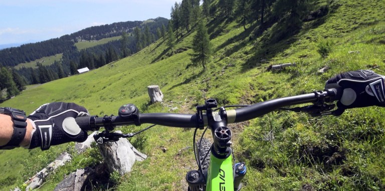 La Cima Bella è una classica dello sci alpinismo d’inverno, salirla con la ebike è una figata.Il largo crinale d’erba è tutto per me oggi.E’ bello arrivare in cima alla Cima Bella.L’alpeggio sul versante nord della montagna si raggiunge per un sentiero poco appariscente.Perché seguire la strada se c’è un bel troj più divertente?This is freeride.Noie meccaniche per un banale ramo fra i raggi: gabbia del cambio piegata di brutto.Si sale per il 403 all’ampia sella erbosa fra il Sagran e lo Starhand.Sul sentiero pedalando in salita, eh già, mica a piedi come una volta :).L’arrivo in sella sotto un sole cattivissimo.Il sentiero 403 s’infila nel bosco.Me lo ricordavo bello ed è rimasto abbastanza ben conservato dopo un inizio un po’ scavato.E molla quei freniii…Fine della seconda discesa alla Sella di Lom.La traversata del versante nord dell’Osternig è stata da mal di testa: ad un certo punto la forestale termina con questa bella catasta di alberi tagliati, di là c’è una misera traccia di sentiero che finisce nel niente. Anche il sentiero 477 è da evitare, forse, col senno di poi e cartine più aggiornate della Tabacco, bisognava stare più bassi su un’altra strada forestale.Arrivato in qualche modo a Sella Bistrizza non mi resta che farmi una birra e uno strudel, sì perché ho fatto gli ultimi 150 metri di dislivello a piedi senza più batteria dopo tutto il Turbo di oggi 😦 .Per fortuna che mi attende una discesa da antologia, mulattiera rettilinea con radici superasciutte da fare tutta d’un fiato.Si entra nel bosco…… e si molla tutto!Peccato rallentare per i pedoni, si scherza, eh!!!La ragazza mi aspetta a metà tornante, scelta discutibile…… mi precede per un tratto…… per poi decidere di fermarsi, grazie signorina!Il lungo tratto di sterrata fino all’Osteria Al Camoscio è molto frequentato.Finita! 3 salite, 3 discese, 1500 metri di dislivello in 27 km ravani compresi, in ogni caso un grande giro.