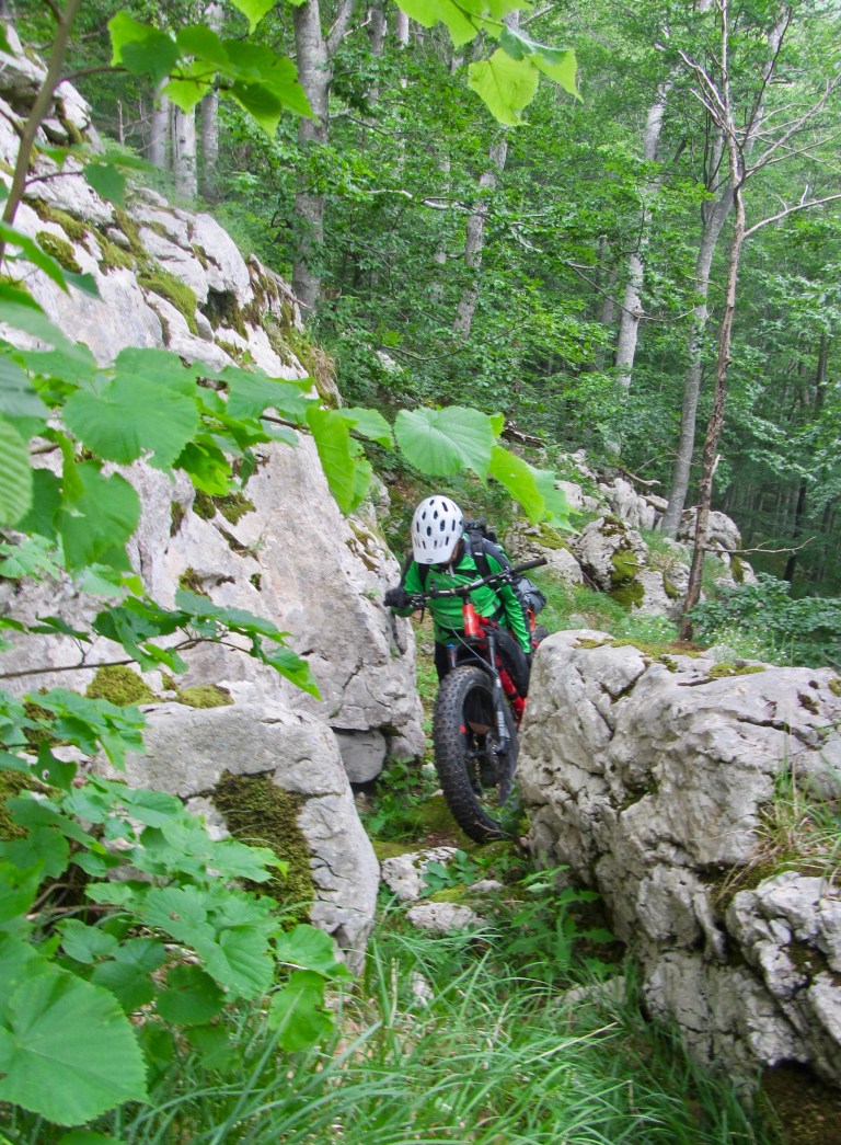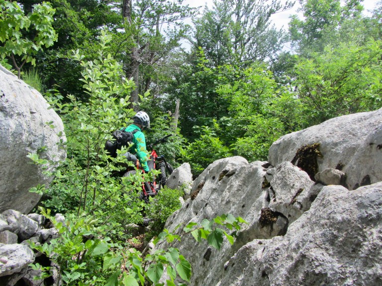 Diciamolo, è stato un’epic fail clamoroso, un sentiero impedalabile al 95% difficilmente praticabile anche a piedi vista la quantità di alberi abbattuti nella parte del bosco e rovi e spine assassine sulla mulattiera che scende al mare, mulattiera che dopo 15 km di su e giù a piedi per una serie infinita di doline su sentierino quasi dismesso abbiamo imboccato come via di fuga alla strada costiera, l’avevamo già messo in conto prima di partire studiando le mappe ma non ci si immaginava una discesa fatta per 3/4 con la bici a mano!