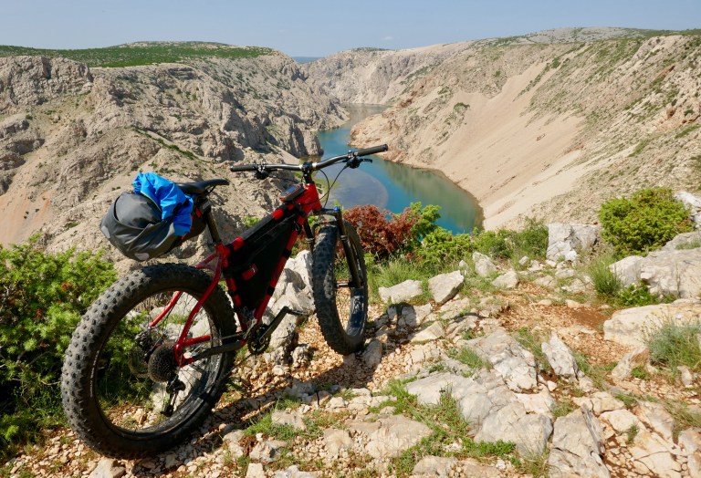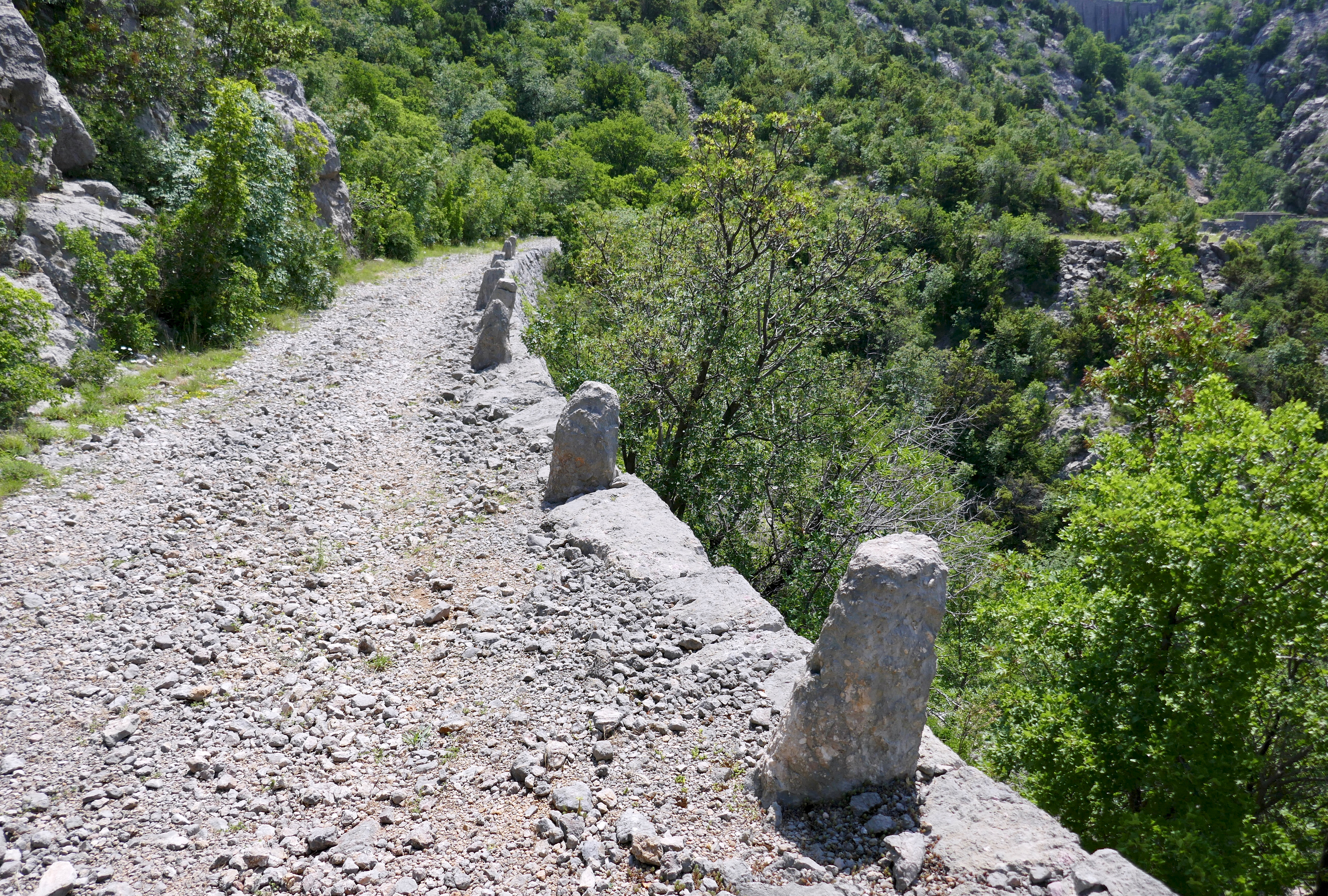 Come ultima digressione pedaliamo per qualche km sulla vecchia strada costiera con i suoi viadotti e le massicciate in pietra di chissà che epoca, qualche ricerchino su gugol bisognerà farla. Avevamo calcolato bene anche l’arrivo a Sveti Jurai, discesa di 10 km sui 30 percorsi e arrivo trionfale al parcheggio dopo 407 km di cui 85 su sentiero, 5400 metri di salite e 6860 di discese, Velebit checked, Paklenica checkrd, Pag checked.