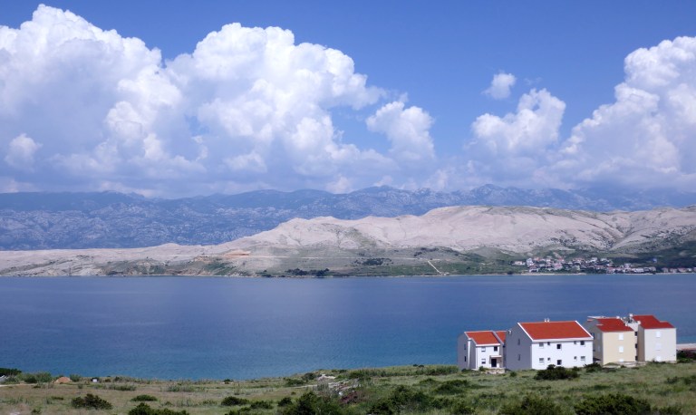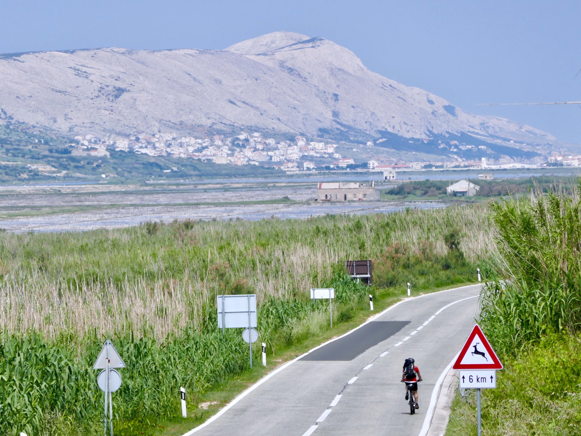 La mattina partenza presto, la meta di oggi è Novalja sull’isola di Pag, e per la prima volta pedaliamo su strade infami, larghe come superstrade e trafficatissime e siamo appena a maggio. Per fortuna è tutta un saliscendi, così ho la bella idea di spingere nelle discese in posizione aerodinamica (!) per rilanciare la Mukluk nella salita successiva, la cosa funziona perché riesco a tenere una velocità media decente, sono davanti Stefano e non mi volto fin quando non sono in vista del Paški Most, il ponte che unisce Pag alla terraferma, ma dietro di me non lo vedo. Al baretto del ponte bevo una Coca assieme ad una intera corriera di pensionati tedeschi e dopo un po’ arriva lui un po’ immusonito, ma non volevo correre, era solo che mi ero rotto di tutto questo traffico e non vedevo l’ora di passare questo benedetto ponte che non arrivava mai. Chissà perché, ma pedalare sulle strade dall’asfalto scolorito dell’isola mi ha subito rilassato, arriviamo assieme a Pag dove pranziamo e ci idratiamo per bene, ormai è scoppiata l’estate che sembra essere in luglio.