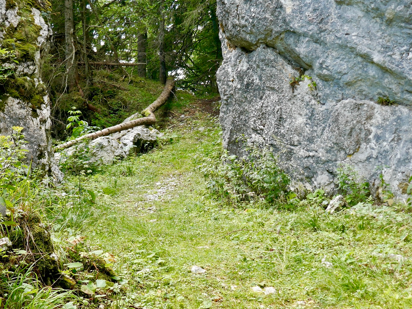 Il sentiero in questione è un’antica mulattiera di guerra marcata con il segnavia CAI 429 che da casera Slenza alta 1478 metri, posto isolato e a suo modo suggestivo, scende alle case Pramolina 928 metri sopra Pontebba, 600 metri di troj, per i primi 100 metri in realtà non è un granchè, un po’ tortuoso e muschioso (qui di domenica in agosto non passa anima viva neanche a piedi), poi diventa scorrevole e molto vario con continui cambiamenti di pendenza, una specie di mini bike park naturale, una rarità qui in Friuli abituati come siamo a zig zag noiosetti. Le interruzioni tuttora rimaste sono limitate a due-tre passaggi con grossi alberi di traverso in posizione troppo critica per fidarsi a smuoverli vista la massa non indifferente in bilico, più un ultimo ostacolo nella parte finale rappresentato da un gigantesco albero caduto nel bosco pianeggiante che va aggirato a destra per evidenti tracce di passaggio dopo il quale c’è il gran finale con troj veloce e divertentissimo. Arrivati alle Case Pramolina bisogna per forza seguire la sterrata che scende a Plans e alla S.S.13, alternative non ne ho trovate anche se sulla Tabacco qualche linea tratteggiata farebbe pensare a sentierini del tempoche fu.