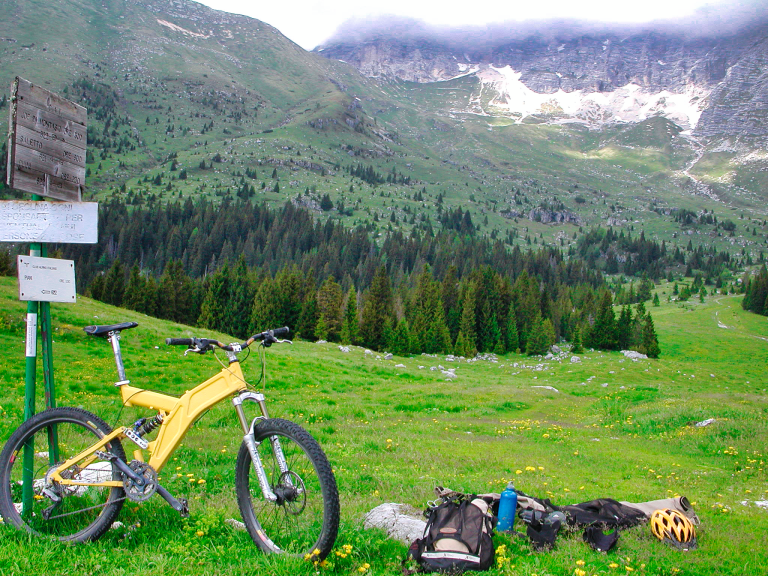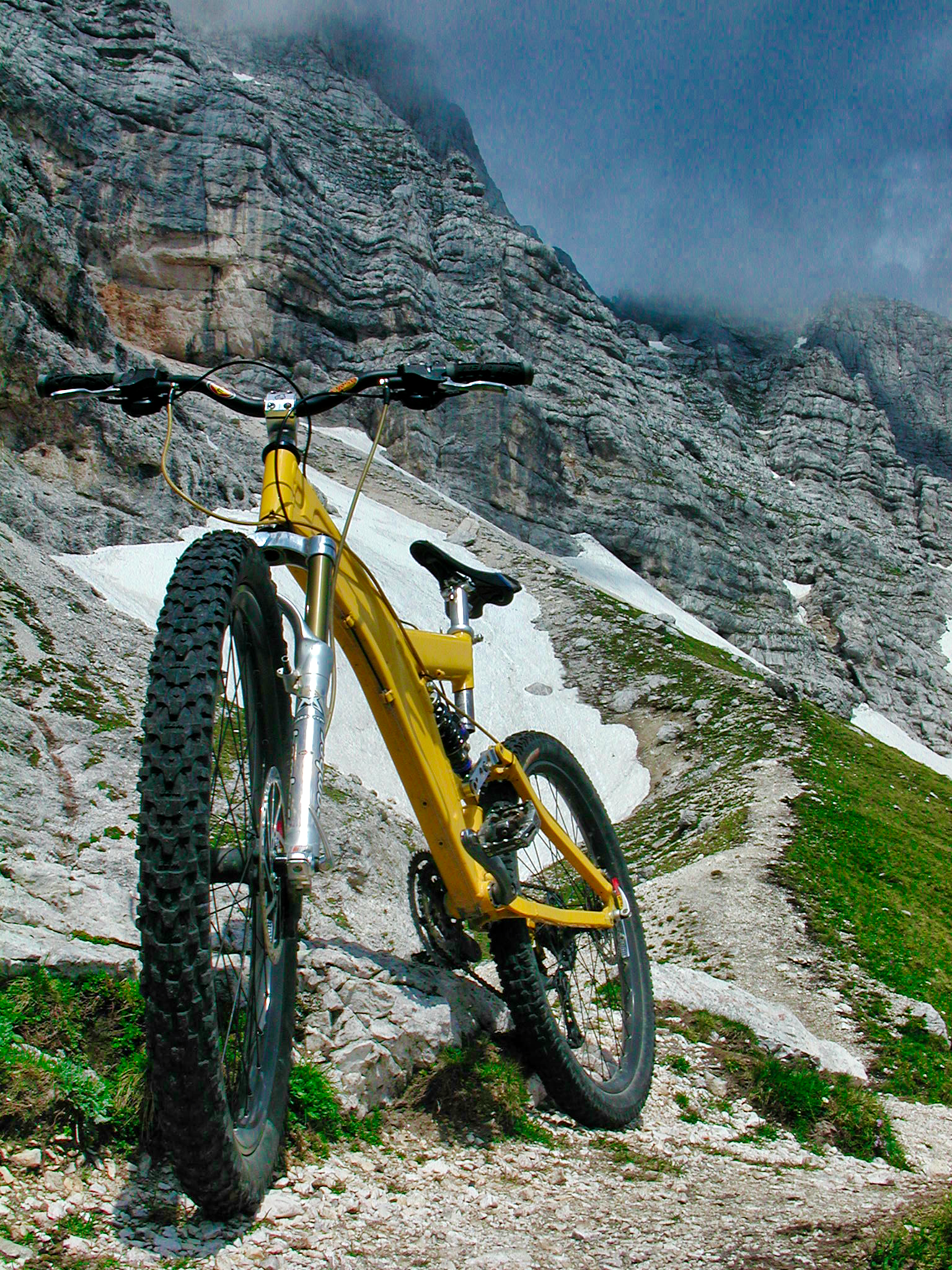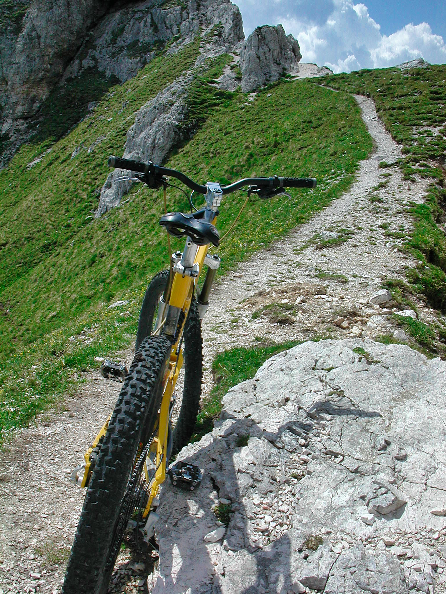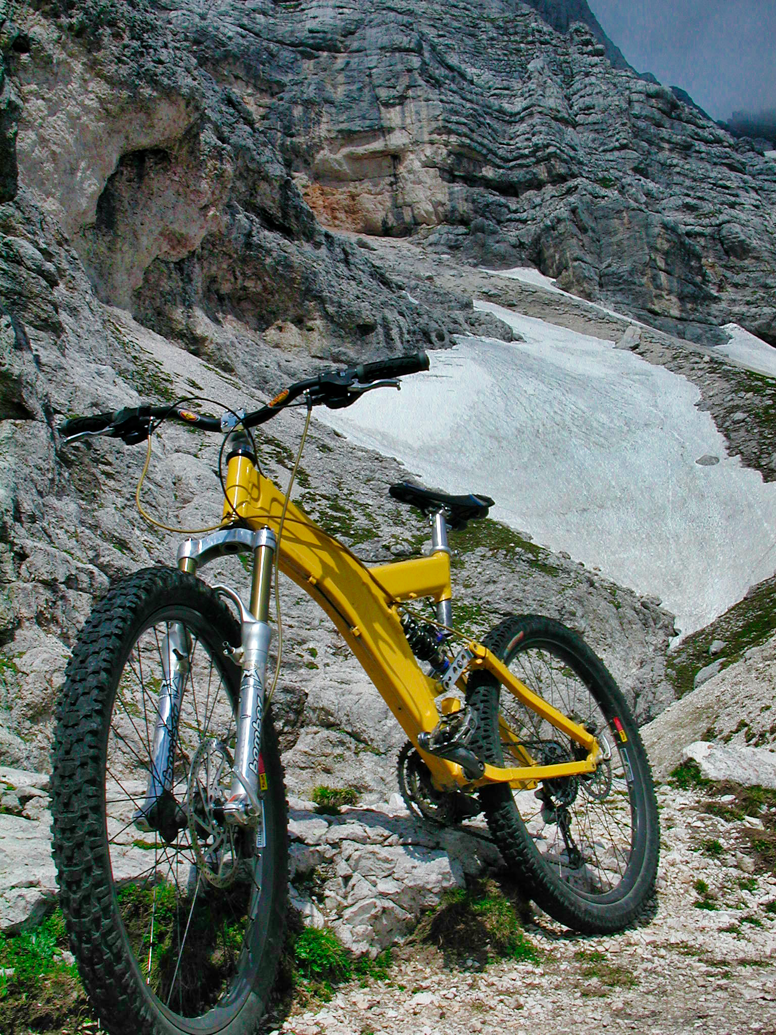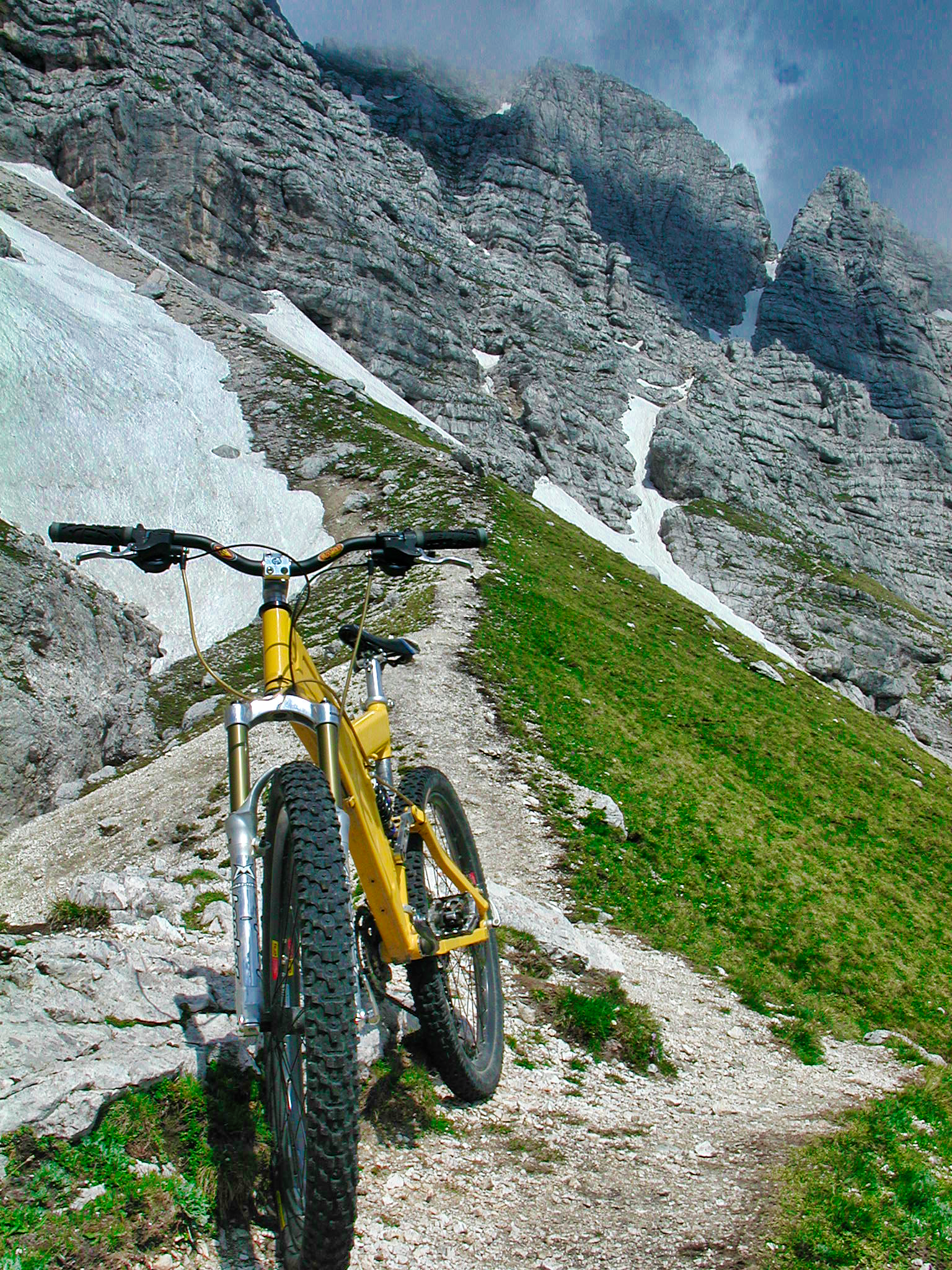 La mia bici all’epoca era un’ Olympia-non-so-più-quale-modello, per me la prima full suspended, all’epoca veniva pubblicizzata nientemeno come “la bici ufficiale della nazionale taiwanese di mtb” e sticazzi, fattosta che nonostante il terribile telaio di rigidità pari allo zero l’ho portata in giro per le Alpi Carniche, Giulie, le Dolomiti e le ho fatto fare pure il giro del Monte Bianco, ai tempi non soffrivo di GAS, Gear Acquisition Syndrome tipica della mezza età e il mezzo si teneva per anni e anni finché non si disfava. L’ultima volta che l’ho cavalcata è stata appunto a Forca Disteis, non proprio un percorso inseribile in una guida di itinerari mtb, però famosa per le sciate primaverili fuori pista e senza dubbio una meta escursionistica a cinque stelle anche senza neve. Una mattina a buon’ora, era la fine di maggio del lontano 2003, partito da Sella Nevea direzione Piani del Montasio non sapevo ancora se mi sarebbe riuscito portare la bici a mano per i 700 metri di sentiero su in forcella, ma essendo ancora abbastanza giovane e testardo e nonostante la giornata un po’ grigetta alla fine con qualche fatica alla forca ci arrivai. Ai tempi giravo con una rudimentale fotocamera digitale e scattavo sì e no 5 foto a gita, mi bastava la classica cartolina della bici in cima e poi giù a manetta, si spiegano così le poche testimonianze fotografiche del periodo. Rivedendo quelle fatte a Forca dei Disteis mi sembrano ancora abbastanza interessanti, di sicuro da quelle parti non sono passate tante bici neanche negli anni seguenti, la cosa forse più bella durante la discesa sul bellissimo single track a zig zag appena accennati è che dovevo fare attenzione alle marmotte che facevano capolino dalle tane scavate proprio sul sentiero, povere bestiole.