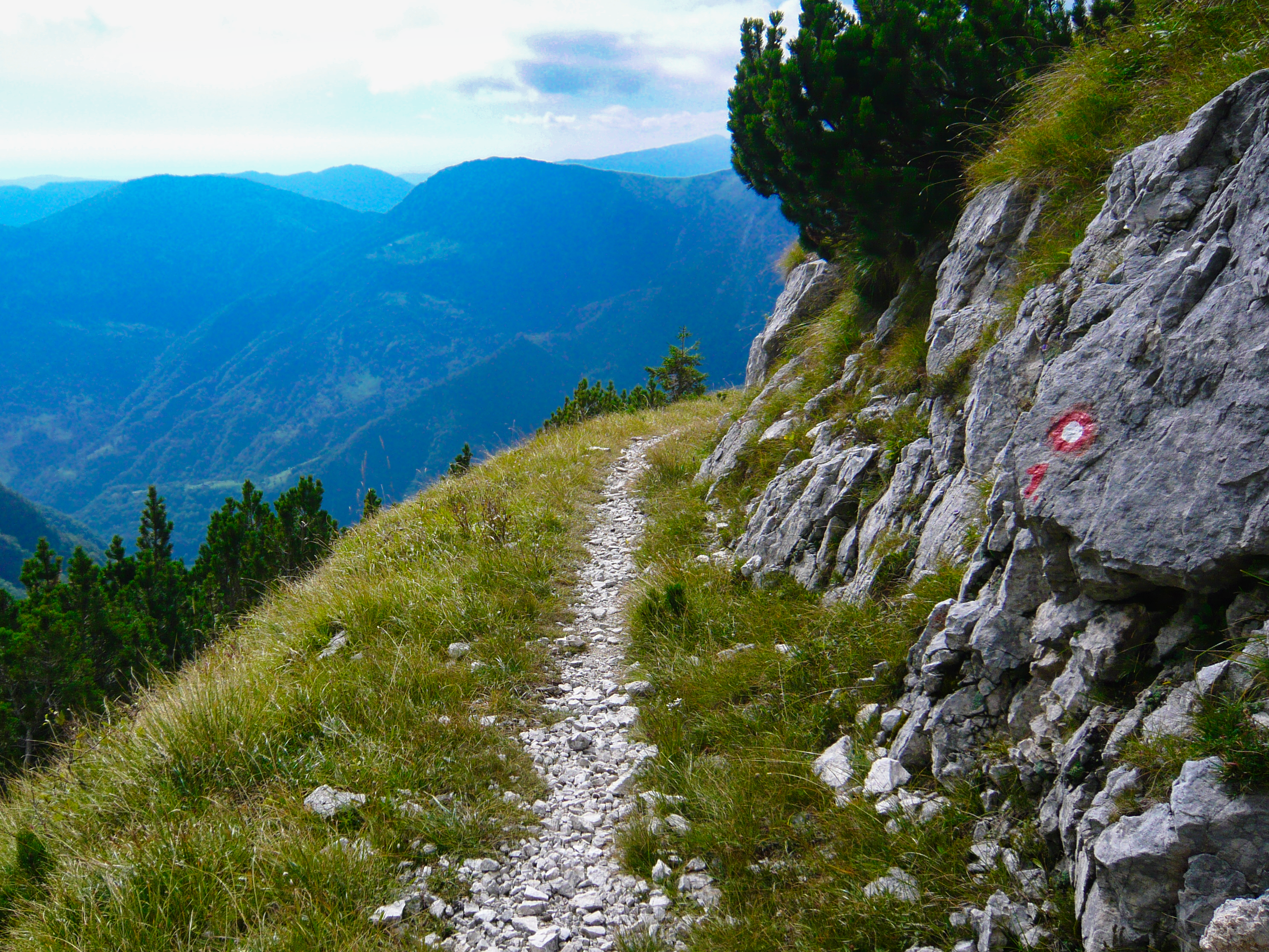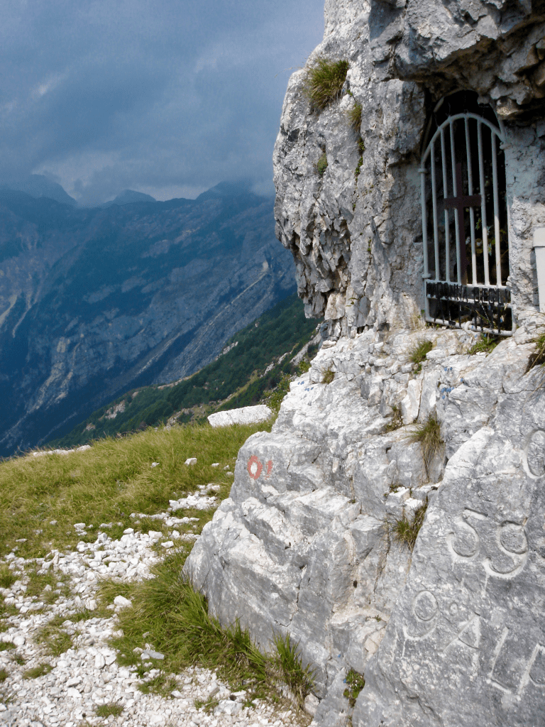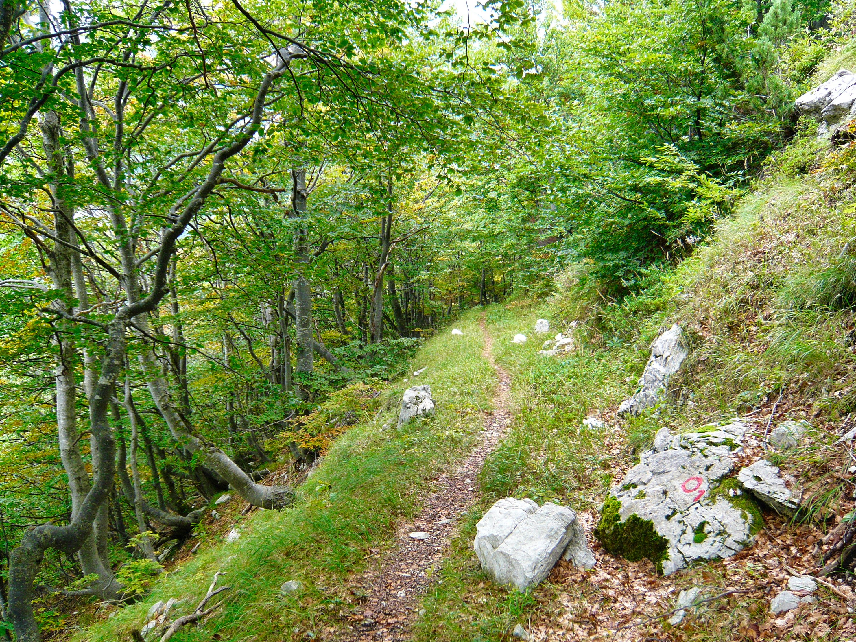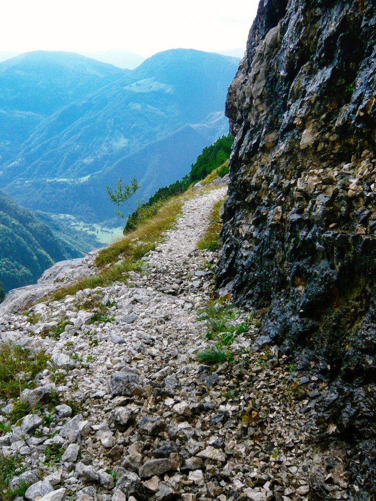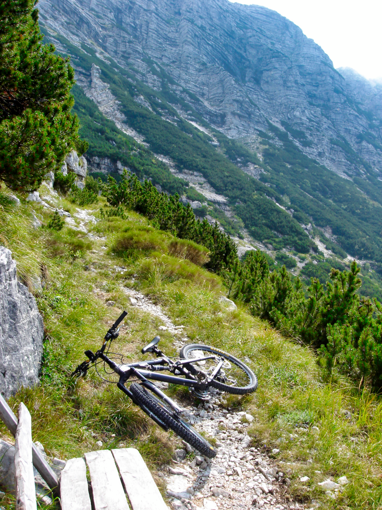 Nell’estate del 2006 mi venne la smania dei sentieri sloveni che ad eccezione dello Slavnik erano a me del tutto sconosciuti, e fu una vera impresa la ricerca di informazioni sul web al riguardo, alla fine l’unica fonte attendibile era il sito mtbture ad uso esclusivo dei madrelingua, e hai voglia a comprare un dizionario sloveno-italiano o usare il traduttore di google, metà dei termini usati per noi impronunciabili avevano e hanno tuttora significati decisamente oscuri. In particolare non avevo mai sentito parlare della mulattiera di guerra che da Tolmino saliva al Krn/Monte Nero costruita dagli austriaci per rifornire il loro campo base ai piedi della Batognica ma le foto anche se di bassa qualità mi incuriosirono al punto da tentare un’incursione “behind the enemy lines” per raccogliere informazioni di prima mano. Con la fotocopia di una approssimativa mappa della zona in tasca parto una mattina di giugno ad ore impossibili per sfuggire ai temuti controlli, lascio l’auto a Tolmino e inizio la salita per il bellissimo alpeggio delle Tolminske Raune, continuo nel bosco in direzione Rifugio Planina Razor dove non mi azzardo ad avvicinarmi e m’infilo letteralmente fra due giganteschi massi che segnano l’inizio di quella che per me sarà sempre “LA Mulatjera”, percorso unico nel suo genere, una cengetta strappata alla roccia a picco sulla valle dove Storia e Natura si danno la mano per kilometri e kilometri, una vera Macchina del Tempo per rivivere un’esperienza di cento anni fa, strano riuscire ancora oggi a passarci abbastanza comodamente in mtb divertendosi pure. Dopo circa 7-8 km di traversata in saliscendi si inizia a scendere per facile e bel sentiero alla Planina Dobreniščica usata dai cacciatori locali che sembra non gradiscano per niente i biker di passaggio, meglio controllare da distanza e approfittare, come ho fatto realmente io, di una loro distrazione per passare di soppiatto, non si sa mai. Da qui ci sarebbero due possibilità : continuare con un tratto in salita fino alla testata della valle e scendere a sinistra a delle casermette diroccate (Prehodci) ed a una mulattiera quasi abbandonata in direzione sud nella solitaria Valle del Tolmino, oppure, consigliabile, si gira subito a sinistra per prati sulla traccia che diventa sentiero sassoso e abbastanza tecnico a tornanti nel bosco fino a oltrepassare un ponticello in pietra, siamo alle sorgenti del Tolmino e possiamo concederci un sorso d’acqua freschissima all’ombra dei faggi. A sinistra del ponte si prende un sentierino che costeggia il torrente e in breve si è sul bel prato davanti ad una curiosa casetta nel bosco, la planina Pod Osojnico, bisogna attraversare il terreno recintato della malga e si continua sulla larga mulattiera che con una breve salita arriva ad una selletta con cancello. I single track sono ormai alle nostre spalle, ci aspetta una discesa a Tolmino piuttosto lunga e tutta all’ombra all’inizio su sterrata ghiaiosa, poi lastricata e veloce, infine larga e asfaltata, aperta al traffico e con qualche tratto in contropendenza. Per concludere in bellezza, arrivati alle prime case in località Ralne, praticamente dove si ha l’impressione di essere finalmente tornati alla luce dopo tanta oscurità, prendere il sentiero subito a sinistra (tabella) che porta allle gole del Tolmino, Tolminka korita, e godersi così ancora 150 metri di bel sentiero nel bosco fitto e venire scodellati direttamente davanti alla biglietteria delle gole. Girando a destra sulla stradina asfaltata, dopo neanche 100 metri prendere a sinistra la mulattiera che attraversa i campi e arriva ad un cimitero di guerra austriaco, da dove non resta che seguire dritti la strada asfaltata per il centro di Tolmino. Superfluo aggiungere che se non ti fermi a bere una veliko pivo alla fine di questo memorabile giro non hai ancora capito niente dello spirito della mountain bike.