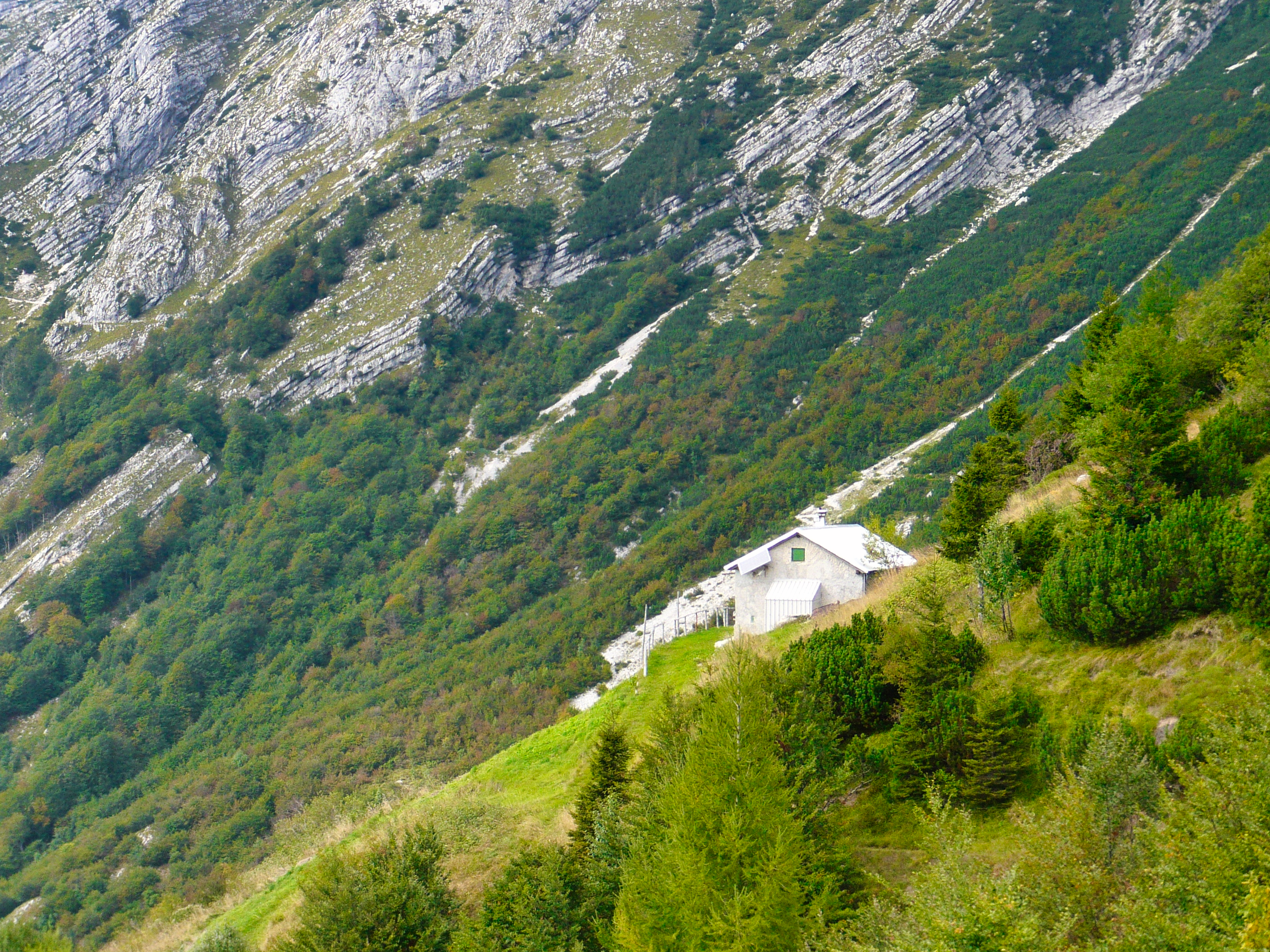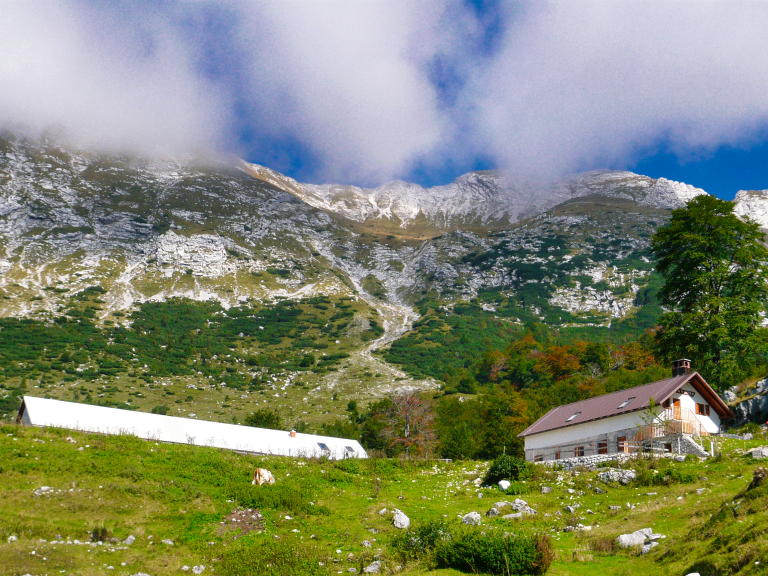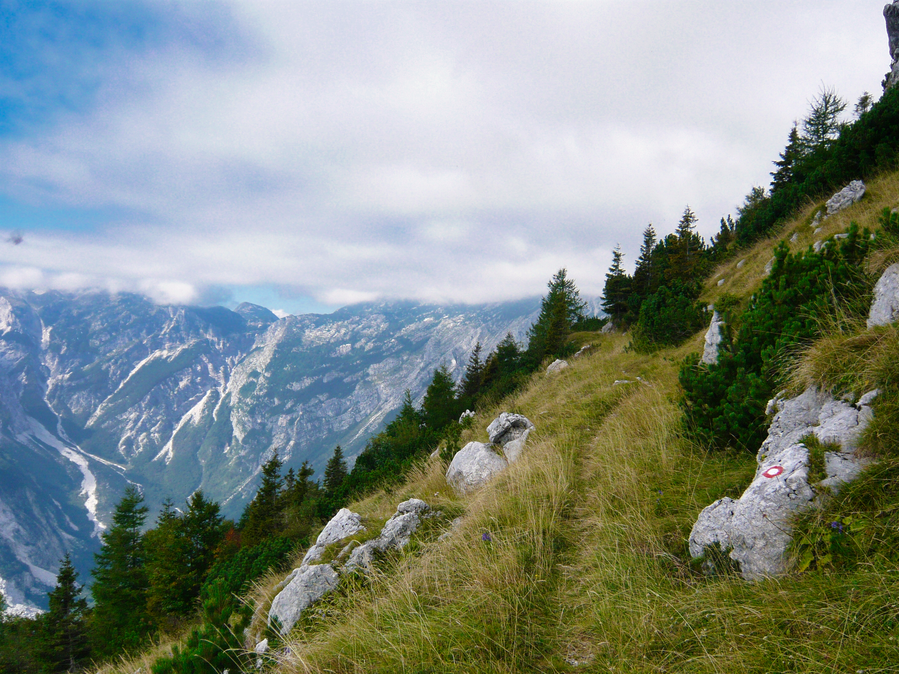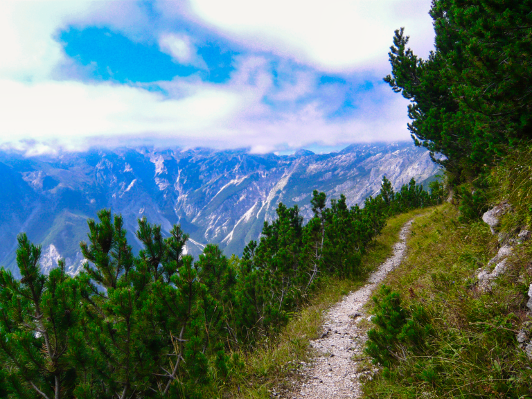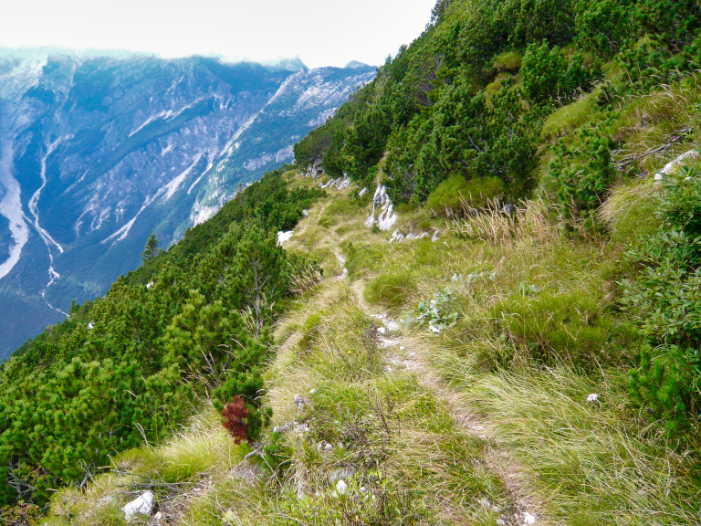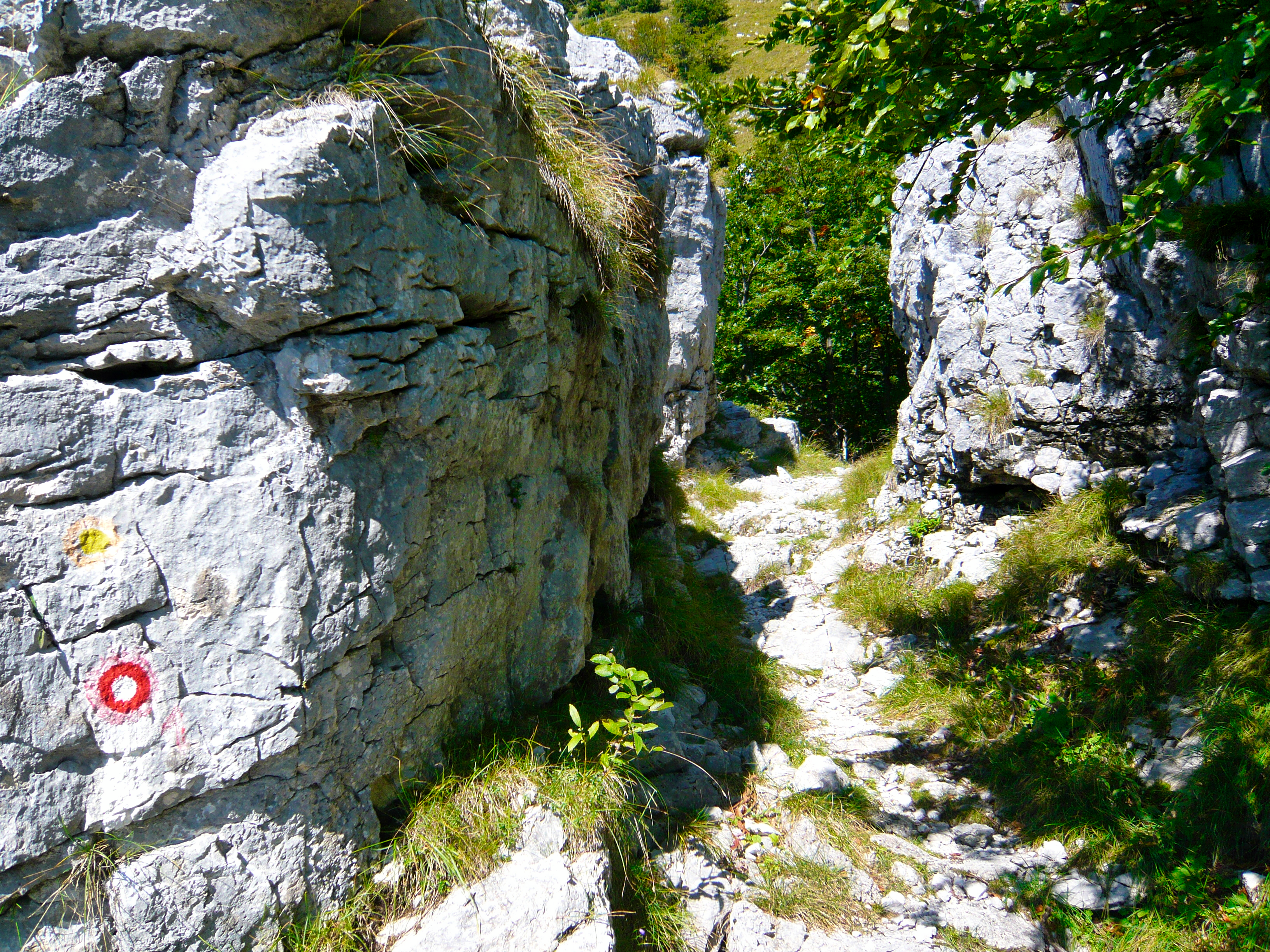 Nell’estate del 2006 mi venne la smania dei sentieri sloveni che ad eccezione dello Slavnik erano a me del tutto sconosciuti, e fu una vera impresa la ricerca di informazioni sul web al riguardo, alla fine l’unica fonte attendibile era il sito mtbture ad uso esclusivo dei madrelingua, e hai voglia a comprare un dizionario sloveno-italiano o usare il traduttore di google, metà dei termini usati per noi impronunciabili avevano e hanno tuttora significati decisamente oscuri. In particolare non avevo mai sentito parlare della mulattiera di guerra che da Tolmino saliva al Krn/Monte Nero costruita dagli austriaci per rifornire il loro campo base ai piedi della Batognica ma le foto anche se di bassa qualità mi incuriosirono al punto da tentare un’incursione “behind the enemy lines” per raccogliere informazioni di prima mano. Con la fotocopia di una approssimativa mappa della zona in tasca parto una mattina di giugno ad ore impossibili per sfuggire ai temuti controlli, lascio l’auto a Tolmino e inizio la salita per il bellissimo alpeggio delle Tolminske Raune, continuo nel bosco in direzione Rifugio Planina Razor dove non mi azzardo ad avvicinarmi e m’infilo letteralmente fra due giganteschi massi che segnano l’inizio di quella che per me sarà sempre “LA Mulatjera”, percorso unico nel suo genere, una cengetta strappata alla roccia a picco sulla valle dove Storia e Natura si danno la mano per kilometri e kilometri, una vera Macchina del Tempo per rivivere un’esperienza di cento anni fa, strano riuscire ancora oggi a passarci abbastanza comodamente in mtb divertendosi pure. Dopo circa 7-8 km di traversata in saliscendi si inizia a scendere per facile e bel sentiero alla Planina Dobreniščica usata dai cacciatori locali che sembra non gradiscano per niente i biker di passaggio, meglio controllare da distanza e approfittare, come ho fatto realmente io, di una loro distrazione per passare di soppiatto, non si sa mai. Da qui ci sarebbero due possibilità : continuare con un tratto in salita fino alla testata della valle e scendere a sinistra a delle casermette diroccate (Prehodci) ed a una mulattiera quasi abbandonata in direzione sud nella solitaria Valle del Tolmino, oppure, consigliabile, si gira subito a sinistra per prati sulla traccia che diventa sentiero sassoso e abbastanza tecnico a tornanti nel bosco fino a oltrepassare un ponticello in pietra, siamo alle sorgenti del Tolmino e possiamo concederci un sorso d’acqua freschissima all’ombra dei faggi. A sinistra del ponte si prende un sentierino che costeggia il torrente e in breve si è sul bel prato davanti ad una curiosa casetta nel bosco, la planina Pod Osojnico, bisogna attraversare il terreno recintato della malga e si continua sulla larga mulattiera che con una breve salita arriva ad una selletta con cancello. I single track sono ormai alle nostre spalle, ci aspetta una discesa a Tolmino piuttosto lunga e tutta all’ombra all’inizio su sterrata ghiaiosa, poi lastricata e veloce, infine larga e asfaltata, aperta al traffico e con qualche tratto in contropendenza. Per concludere in bellezza, arrivati alle prime case in località Ralne, praticamente dove si ha l’impressione di essere finalmente tornati alla luce dopo tanta oscurità, prendere il sentiero subito a sinistra (tabella) che porta allle gole del Tolmino, Tolminka korita, e godersi così ancora 150 metri di bel sentiero nel bosco fitto e venire scodellati direttamente davanti alla biglietteria delle gole. Girando a destra sulla stradina asfaltata, dopo neanche 100 metri prendere a sinistra la mulattiera che attraversa i campi e arriva ad un cimitero di guerra austriaco, da dove non resta che seguire dritti la strada asfaltata per il centro di Tolmino. Superfluo aggiungere che se non ti fermi a bere una veliko pivo alla fine di questo memorabile giro non hai ancora capito niente dello spirito della mountain bike.