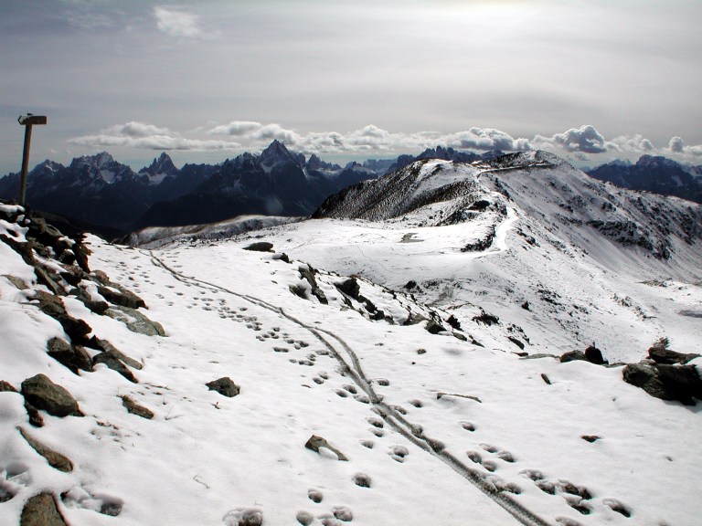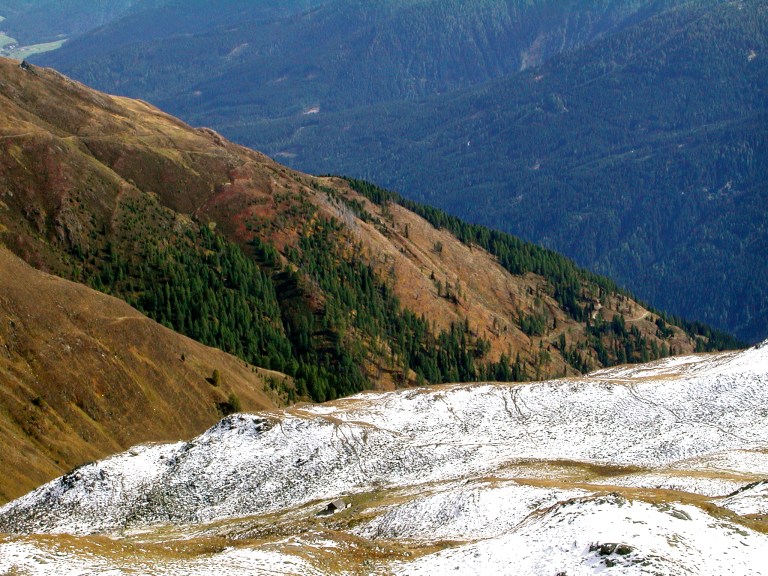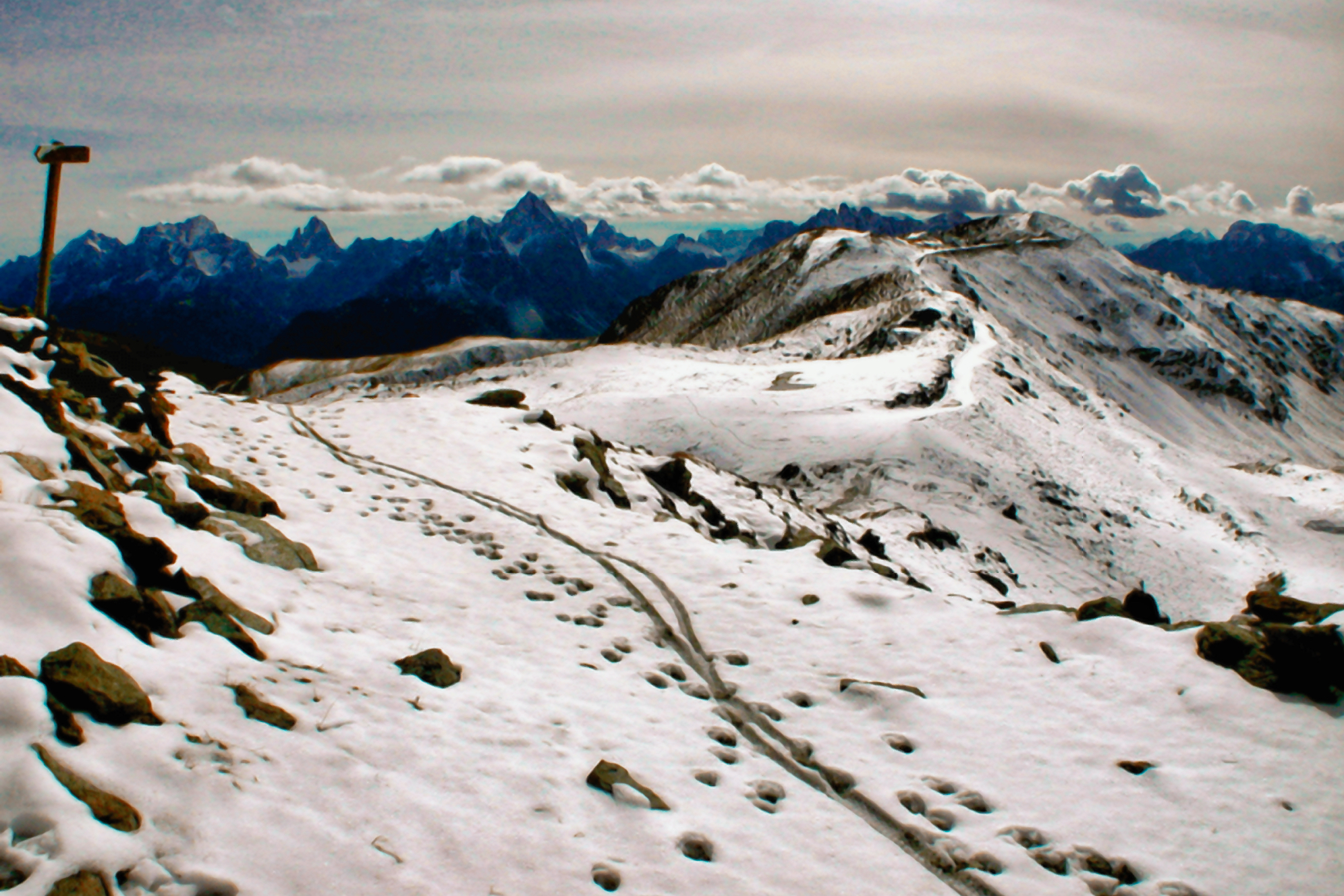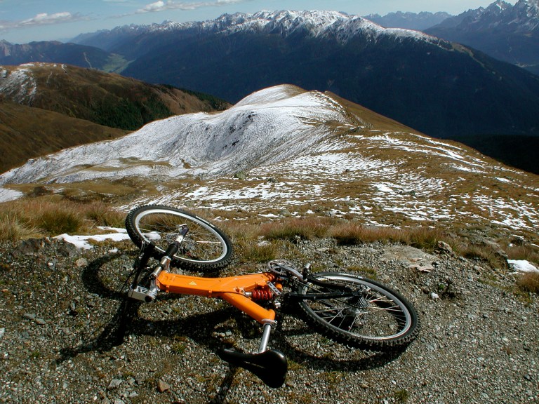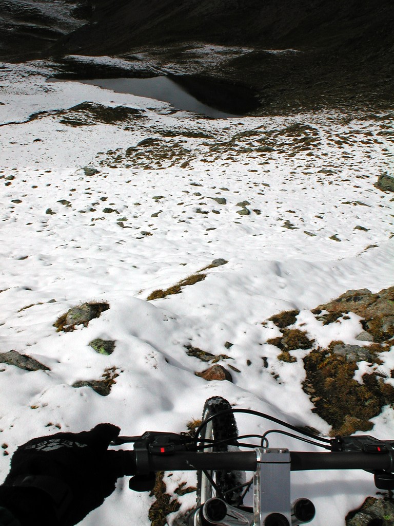 Itinerario scoperto nei primi anni di mtb qualche anno dopo voglio ripeterlo da solo, è un settembre particolarmente piovoso e parto da Udine all’alba destinazione Dobbiaco, la mattina è fredda come quasi a novembre e la neve ha già fatto la sua prima apparizione sulle cime più alte. Ho vaghi ricordi della gita ma rivedendo le foto mi par di ricordare il freddo becco patito pedalando in salita, la sosta in cima limitata alle due-tre cose indispensabili, cambiarsi, mangiare qualcosa e un paio di foto, e la frettolosa discesa sul magnifico sentiero 1 nella lunare valle del Blankenbach con le mani congelate, se penso alla stessa discesa fatta l’anno scorso nello stesso mese ma 18 anni dopo è quasi la conferma scientifica del riscaldamento globale.
