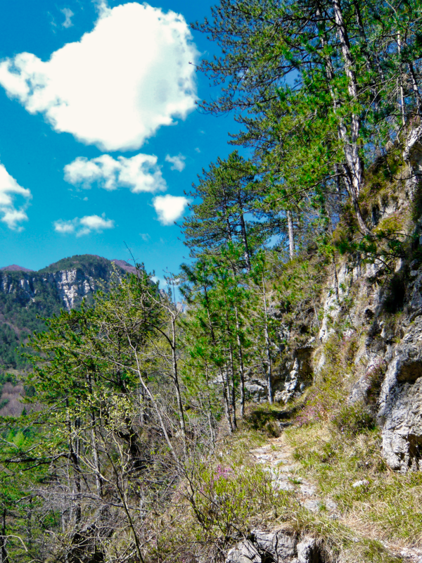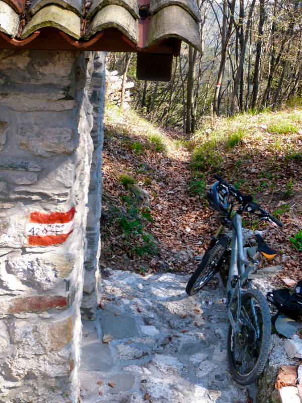 C’è sempre stata una gita che per me segnava l’inizio della stagione estiva a fine aprile o inizio maggio ed in un certo senso la chiudeva a cavallo dei mesi di settembre ed ottobre, il Monticello o Montusel come piace ai locali, una cima isolata di soli 1360 metri sopra Moggio e la Val Aupa con una vista superlativa a 360° che ne fa una meta frequentatissima dagli escursionisti. La prima volta ci sono venuto a camminare con due amici e lungo il sentiero di salita c’era questo telaio arrugginito di bicicletta lasciato lì da qualche buontempone, mancava la Fatina Bionda di quel famoso video pubblicitario per trasformarla in una moderna e-bike, certo che scassandomi le ginocchia sul sentiero di discesa mi ero ripromesso di tornare con la mtb. Ho dovuto aspettare una decina di anni ma ne è valsa la pena, bello sia salire dal paese di Grauzaria e le minuscole frazioni di Badiuz e Borgo di Mezzo che da sud dal Borgo Travasans sopra Moggio Alto, più pedalabile la prima, dopodichè dalla forca con la cappelletta non si fa altro che seguire la stupenda mulattiera militare a pendenza costante, segnavia 421, che porta a pochi metri sotto la cima, non ricordo altre gite con un avvicinamento simile, poco distante dalla pianura ma in ambiente prettamente alpino. La discesa sull’altro versante sempre contrassegnata dal segnavia 421 è oggi un must fra i freerider friulani, ho letto di uno che è sceso un po’ troppo allegramente e su uno dei ripidissimi tornanti della parte alta è finito sul bordo del precipizio e salvato dal Soccorso Alpino, è un tratto che andrebbe affrontato con una certa attenzione anche se non sono necessari i leziosi nose press tanto di moda oggi, quelli lasciamoli ad Hans Rey, mio idolo assoluto. Qualche anno dopo qui ho girato uno dei miei primi video con l’antenata della gopro per gli attuali standard di infima qualità da me intitolato un po’ immodestamente Full Monti, uno dei miei primi post in questo blog se ricordo bene, visto adesso è inguardabile ma dà l’idea della ripidezza del sentiero, vero Alessandro?