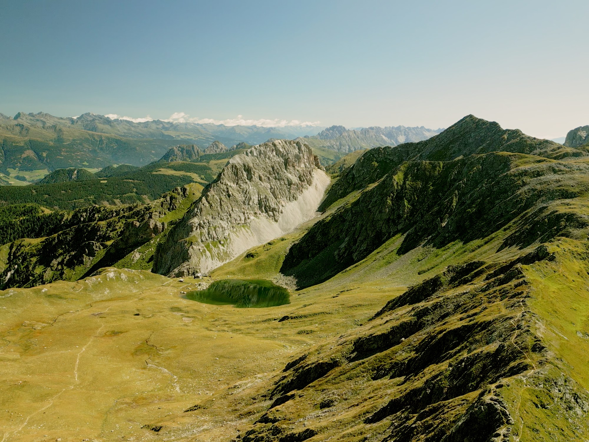 Alle 11 di mattina in forcella, Sella Frugnoni per l’esattezza, nel punto più alto del giro per me è abbastanza insolito, zero fame e zero sete ma una barretta la mangio lo stesso per abitudine. Neanche una nuvola in cielo, finalmente!, e dopo un paio di pano 360 col mini 3 è un vero piacere scendere in bici nell’arietta fresca dei 2500 metri giù al lago verde smeraldo, posto incantevole e quasi sconosciuto agli italiani ma frequentatissimo dagli escursionisti di lingua tedesca. Passato il lago e il rifugio omonimo arriva la parte migliore, sentiero a tornanti mai troppo ripido con fondo ghiaiosetto ma ben ciclabile fino alla verdissima valletta a 1950 metri dove invece inizia la parte rognosa con le ripide scalinate che ricordavo abbastanza toste ma fattibili e che invece a distanza di anni mi sono sembrate più ostiche per via dell’erosione del terreno, una piaga comune a tutti i percorsi di mtb simili, uno a caso tanto per dire la Val Sassovecchio dal Rifugio Locatelli. Sono però solo 130-150 metri di dislivello che si possono anche scendere in parte a piedi, in arrampicata si diceva “A0”. A seguire un bel tratto flow e qualche serpentina nel bosco fino alla sorpresa dal sapore vagamente italiano, la nuova sterratona al posto del sentiero ma tanto siamo quasi a fondovalle e manca poco a Kartitsch.