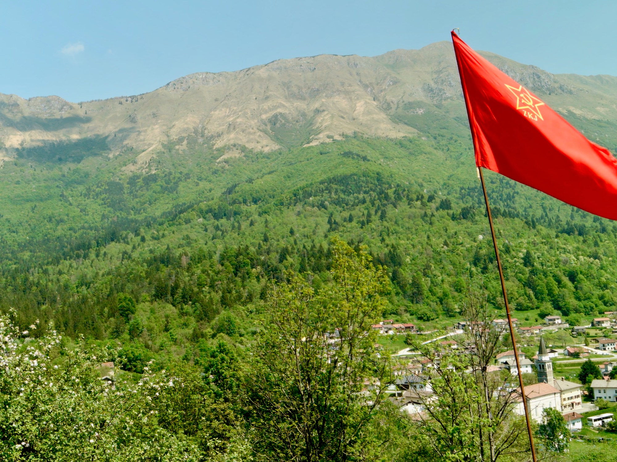 L’idea che le montagne dividano le nazioni non fa parte del DNA del mountain biker che per sua natura è un cittadino del mondo. Noi in Friuli Venezia Giulia siamo fortunati, qui ci sono così tanti giri in bici che attraversano creste montuose a cavallo dei tre Stati confinanti che ci pare la cosa più naturale del mondo, e lo è. Unica nel suo genere è la traversata da Montemaggiore a Breginj in Slovenia, su sterrate e in parte sentieri, con un percorso un po’ avventuroso, tabellato e segnalato ma non indicato sulle mappe Tabacco, che passa per le sorgenti del Rio Bianco e le sue famose cascatelle, scende brevemente alle sorgenti del Rio Nero (Rio Bianco e Rio Nero poco a valle danno origine al Natisone) e poi continua in quota con un’ultima breve discesa a Breginj. Qui se passi subito dopo il Primo Maggio ti può capitare di vedere sulle strade delle strane bandiere di colore rosso, chissà cosa vorranno significare.